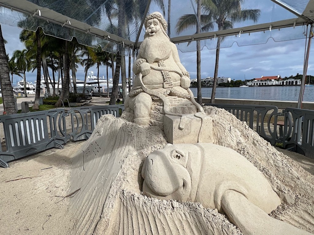 Auf der anderen Seite sind weihnachtliche Sandskulpturen zu sehen, ein riesiger Sandtannenbaum nimmt gleich einen ganzen Platz ein und der Weihnachtsmann passt doch auch gut zum Manatee, oder? Rudolph braucht ja auch mal Pause und vielleicht eine Abkühlung. Andere Länder, andere Sitten.