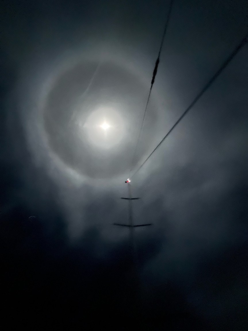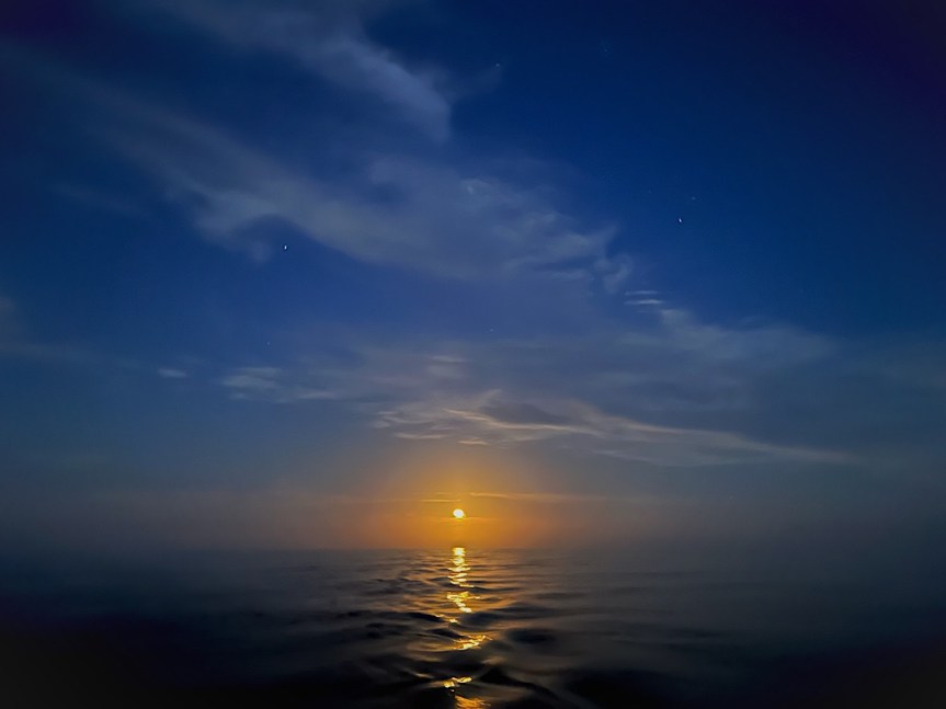 Bisher verwöhnt uns die westliche Karibik. Zwar war zwischendurch etwa 24 Stunden der Motor an, aber bei spiegelglatter See und weiteren Delfinbesuchen, zudem einem schönen Sonnenuntergang und einem fast noch beeindruckenderen Aufgang des Vollmonds ist das leicht zu verschmerzen. Und dann folgt auch noch ein Halo um den Mond, wohl verursacht von Eiskristallen in großer Höhe.