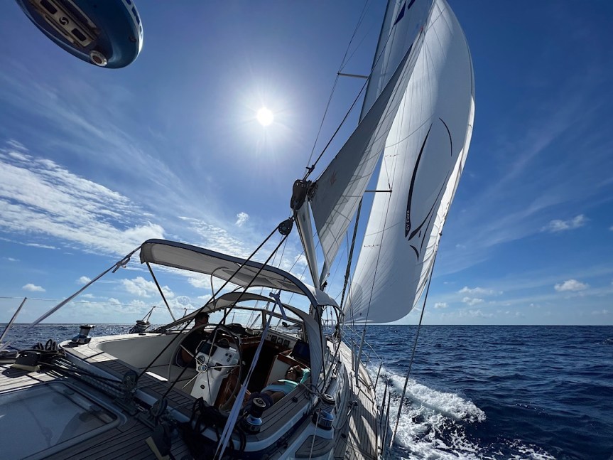 Wir entscheiden uns für einen direkteren als den zunächst geplanten Kurs und werden belohnt. Unter Code0 kreuzen wir zum zweiten mal den Golfstrom, diesmal schräg gegen ihn. So werden aus den 7 bis 8 Knoten durchs Wasser nur 4 bis 5 über Grund. Trotzdem nicht schlecht. Jetzt sind wir knapp 20 sm vor der südlichen Ansteuerung, scheinen soeben den Golfstrom verlassen zu haben. Der Wind frischt auf, wir wechseln auf die Fock.