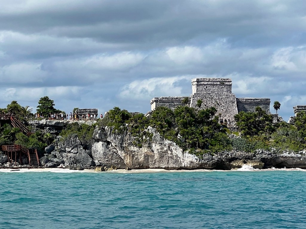Wenige Maja-Tempelanlagen sind direkt am Meer errichtet, insbesondere auch weil die Frischwasserversorgung schwieriger ist, wenn in den notwendigen Cenotes das Salzwasser durch das poröse Kalkgestein sickert und sich unter das Süßwasser schiebt. Eine der wichtigen und bekannten Stätten dieser ungewöhnlichen Art ist Tulum, etwa zwei Stunden Autofahrt südlich unseres Hafens Puerto Morelos. Wobei, diese Fahrt geht auf der gut ausgebauten Carretera 307 durch das Touristenzentrum Playa del Carmen und durchgängig küstennah entlang der „Riviera Maya“ mit ihren luxuriösen Hotelanlagen. Kein Wunder also, wenn der Tempel in Tulum die Touristenmassen anzieht.