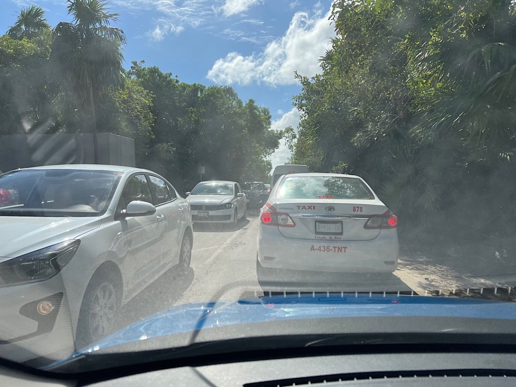 Von der Wasserseite sieht das noch ganz passabel aus. Moment, wieso von der Wasserseite? Auf unserer Anfahrt stauen wir uns zunächst durch den Ort und dann auf einem Strandweg in Richtung der Maya Ruinen.