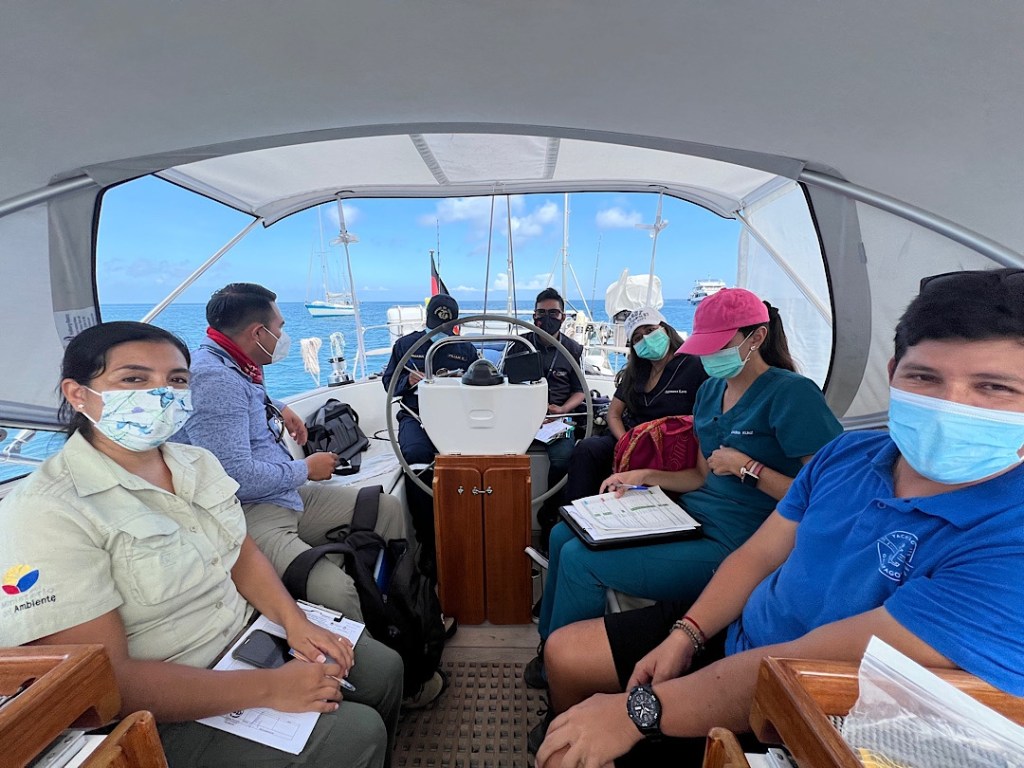 Auf dem Bild sind nur sieben zu sehen? Ja, weil der Taucher (!) gerade schon das Unterwasserschiff kontrolliert. Da darf kein Bewuchs drauf sein, schon wegen einer Seepocke kann er die Einreise verweigern. Dann muss man 40 sm raus, auf gutes Wetter hoffen, tauchend nacharbeiten, 120 US$ zusätzlich bezahlen und bei der nächsten Inspektion hoffentlich unbeanstandet bleiben. Außerdem ist ein Officer des Ministerio del Ambiente (also dem Umweltministerium) schon unter Deck im Salon, weil die Vielzahl seiner Formulare den verfügbaren Platz im Cockpit jetzt wirklich sprengen würde.