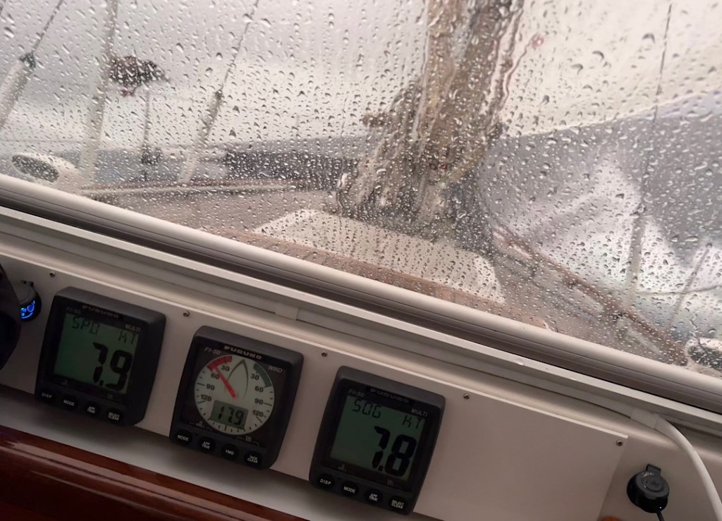 Zur Abwechslung ist heute mal alles grau in grau. Immer wieder Regenschauer und Windwechsel. Immerhin konnten wir außer 4 Stunden in der Nacht bisher zumeist segeln, wenn auch nicht immer in die ganz richtige Richtung. Das ist bemerkenswert, denn nach der gestern per Satellitenmail abgerufenen aktuellen Wettervorhersage wären wir jetzt im Flautengebiet mit maximal 7 Kn Wind in den Böen, wir hatten aber in den Böen über 20 kn. Hoch am Wind nicht ideal, aber eben segelbar.