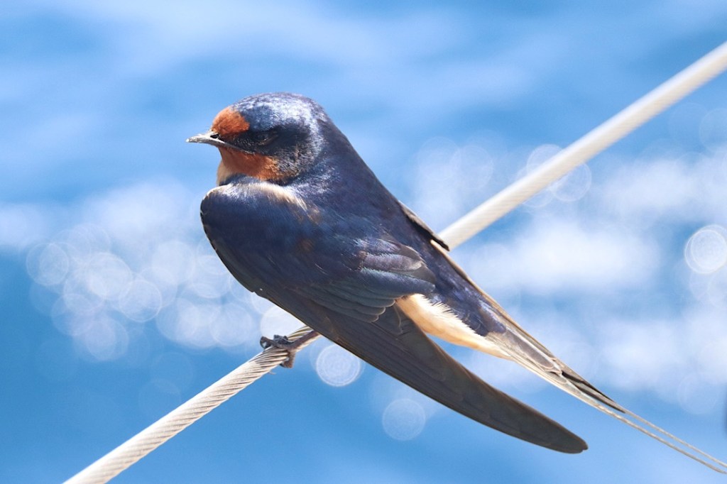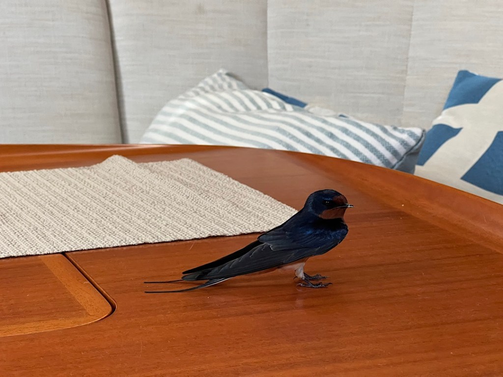 Eine Rauchschwalbe landet auf unserer Reling. Der herrlich blauschwarz schimmernde Vogel mit der rostroten Stirn und der helleren Brust ist wenig scheu, wirkt allerdings etwas matt. Oft habe ich gelesen, dass die Besuche solcher kleiner Vögel auf Ozeanpassagen meist damit enden, dass die ausgelaugten Vögel an Bord sterben. Entsprechend besorgt betrachten wir die Schwalbe, stellen ihr frisches Wasser hin. Sie rührt es aber erwartungsgemäß nicht an, vielleicht ist ihr genetisch einprogramiert das sie auf dem Ozean kein Wasser trinken sollte. Sie verschmäht auch die eigens für sie gejagte und in ihrer Nähe abgelegte Fliege. Aber mit der Zeit wird sie wieder etwas reger, erkundet das Boot, verirrt ?!? sich dabei auch in den Salon. Sucht sich an Bord schattigere Plätze, z.B. im Cockpit innen hinter den Shades. Und dann taucht eine zweite Rauchschwalbe auf. Fortan wechseln die beiden ihre Plätze gemeinsam, bleiben noch einige Stunden an Bord und fliegen dann gemeinsam for t. Hoffentlich ein Happy End.