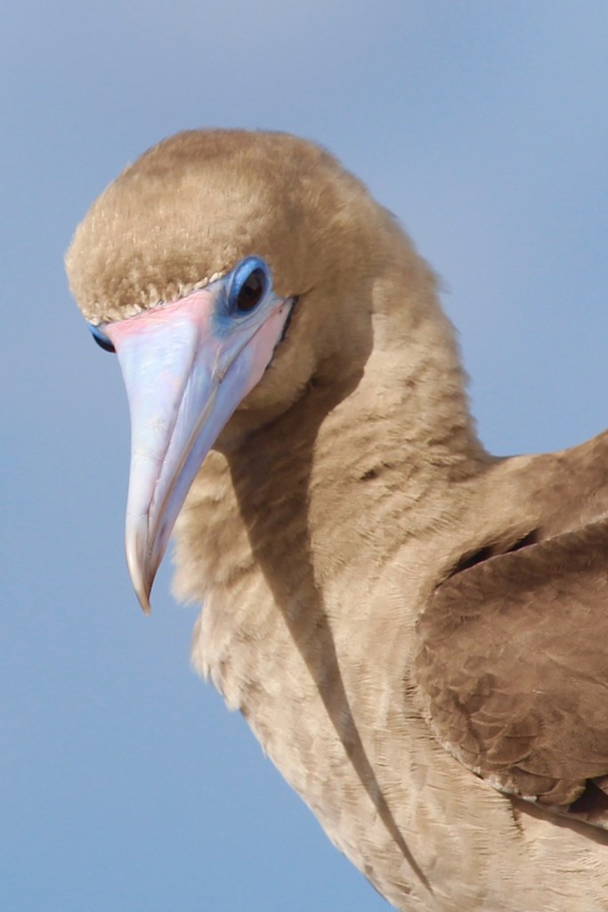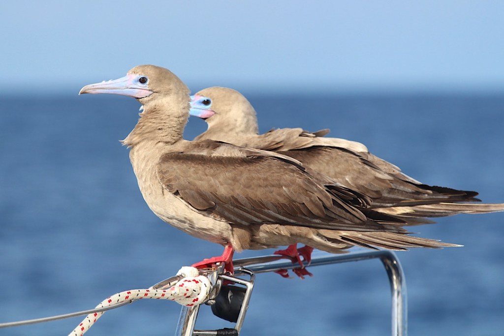 Echter Lichtblick sind einmal mehr die Boobies. Bis zu sieben von ihnen haben sich auf unseren Bugkorb und vorderen Seezaun gequetscht, vier sind die ganze Nacht geblieben, trotz Segelmanövern und gelegentlicher Duschen von den aufspritzenden Wellen. Überwiegend sind es Rotfußtölpel (Blaufußtölpel etwa können sich mit ihren Füßen gar nicht auf Äste oder eben Bugkörbe krallen), ein Brauner Tölpel hat es trotz Abwehrgeschnatter und und in die Schwanzfedern kneifen geschafft, seine gelben Füße zwischne ihre roten auf den Relingsdraht zu setzen. Mit ihren intensiv blau umrandeten Augen, dem hellblauen Schnabel und den rosafarbenem Gesicht, dem braunen Gefieder und dazu den kurzen roten Beinen wirken die zwischen Enten- und Gänsegroßen Vögel ein bisschen, als würden sich die Rotfußtölpel geschminkt zu einem Maskenball versammeln und auf der Toilette noch einmal das Federkleid sortieren. Wobei, Toilette … Gehört auch dazu 😦