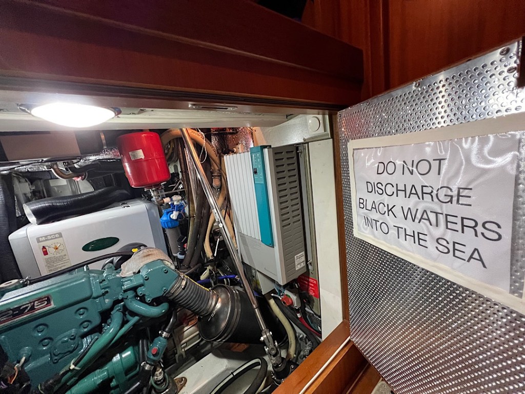 Bei den erforderlichen Dingen wurden bei uns Ölbindetücher und biologisch abbaubares Spülmittel kontrolliert (und jeweils für die Akten fotografiert). Die Kühlschränke wurden inspiziert, allerdings nur oberflächlich, nachdem wir vorher versichert hatten, kein Frischfleisch und keinen Frischkäse dabei zu haben, nach diesen beidem Dingen wurden wir ausdrücklich gefragt. Der Kaffee wurde darauf kontrolliert, dass er gemahlen ist (keine ganzen Bohnen) und nach den verbotenen Chia-Samen wurden wir dreimal gefragt. Die extra angebrachten erforderlichen Schilder an den drei erforderlichen Mülltonnen (Organic, Recyle, Non-Recycle) wurden genauso für die Akten fotografiert wie der (natürlich geschlossene) Hebel für die Entleerung des Abwassertanks. Das ebenfalls notwendige, IM MOTORRAUM anzubringende Schild “Do not discharge black waters into the sea” blieb dagegen unbeachtet, bei den im Innen- und im Außenbereich des Schiffes anzubringenden “Do not throw garbage into the sea” bin ich nicht sicher. Schließlich war ich zwischendurch mal nicht dabei, weil bei jedem Crewmitglied von den beiden Health-Mitarbeiterinnen Temperatur, Sauerstoffgehalt des Blutes und der Blutdruck gemessen wurden. Außerdem war ich immer wieder abgelenkt, wenn eines der unzähligen Formulare zu unterschreiben war.