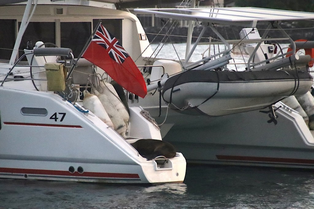 Jede vom Wasser aus irgendwie zugängliche halbwegs ebene Fläche wird hier auf den Galápagosinseln nämlich zügig okkupiert. Seelöwen umkreisen schon während des Ankermanövers das Boot. Im Vorbeifahren sehen wir sie auf anderen Schiffen bereits liegen. Vor allem Katamarane sind betroffen. Die unterste Stufe ihrer Plattformen am Heck ist kaum zu schützen, die meisten Skipper begnügen sich damit, den Zugang zum eigentlichen Deck zu versperren.