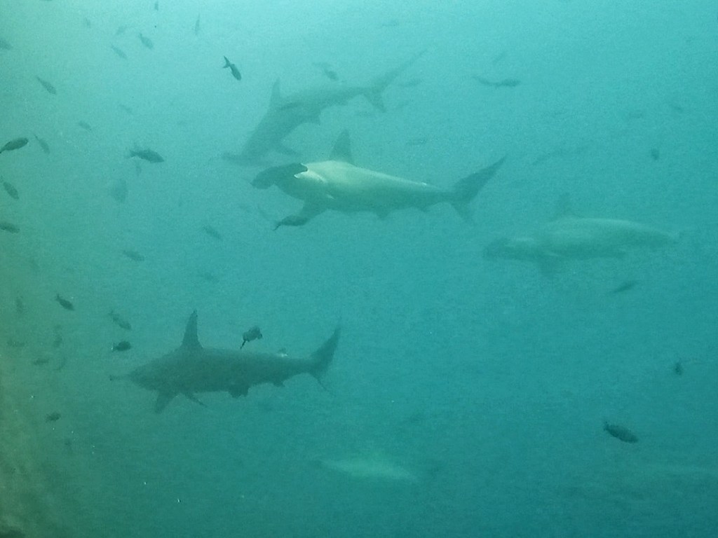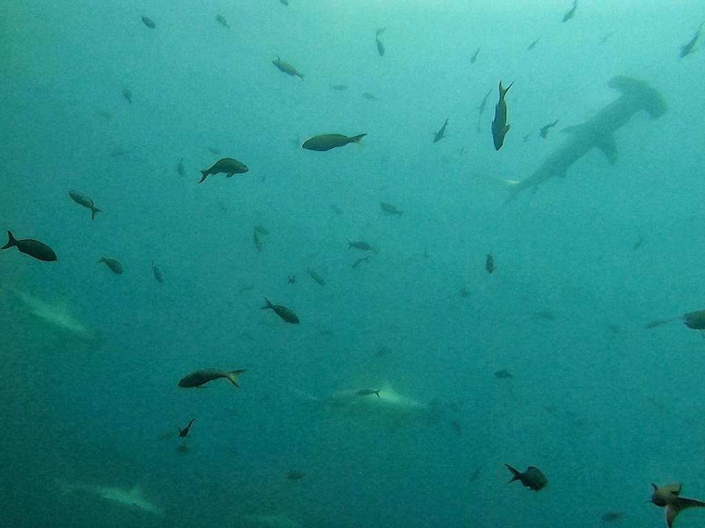 Zum einen zeigen sich gleich beim Sprung vom Tauchboot zwei große Hammerhaie, die sich aber gleich wieder verziehen. Wir tauchen ein paar Minuten an der steil ins scheinbar bodenlose abfallenden Felswand entlang und tatsächlich: da sind sie wieder. Diesmal eine etwas größere Gruppe.