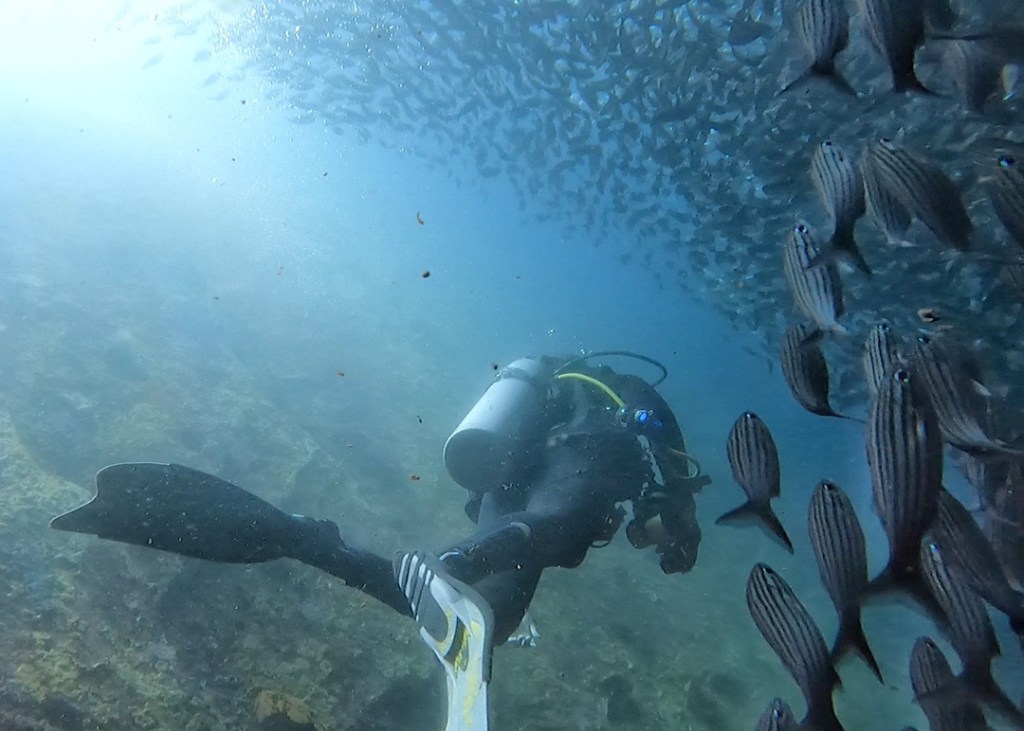 Einen weiteren Wow-Effekt gibts gegen Ende dieses Tauchgangs, als wir eine riesige, sich bewegende Kugel aus unzähligen Fischen vor uns sehen. Man denkt unwillkürlich an Sardinen, aber dies hier ist ist ein Schwarm der auf Galápagos endemischen Schwarzstreifen-Grunzer.