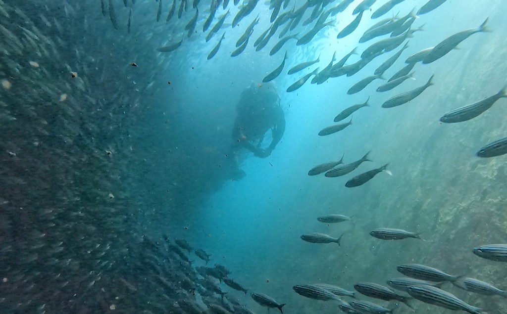 Bei der Oberflächenpause zwischen den beiden Tauchgängen sind die Meinungen unterschiedlich, Wiebke fand den Aufenthalt unter dem Riesenschwarm etwas unheimlich, ich fand’s toll und faszinierend, wie diese Vielzahl von Fischen sich wie ein einziges amorphes Wesen bewegte. Mal Kugel, dann eher eine sich stets verändernde Wolke, beim Hineinschwimmen sich scheinbar ganz langsam teilend und gleich wieder die Lücke schließend.