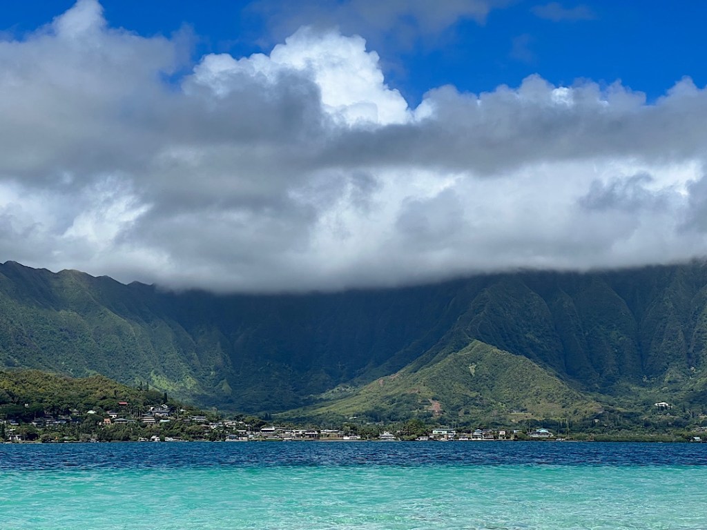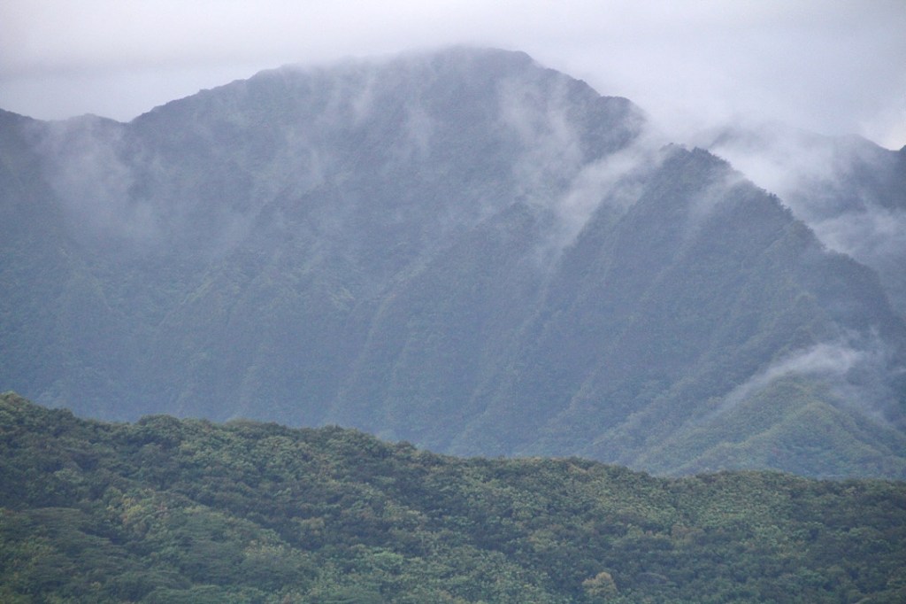 Anders als in Honolulu an O’ahus Westküste bleiben die Wolken hier im dem Wind zugewandten Osten der Insel zumeist nicht auf Abstand, sondern ziehen in schneller Folge durch. Bleiben an den Bergen hängen und bescheren uns immer mal wieder einen Regenguss.