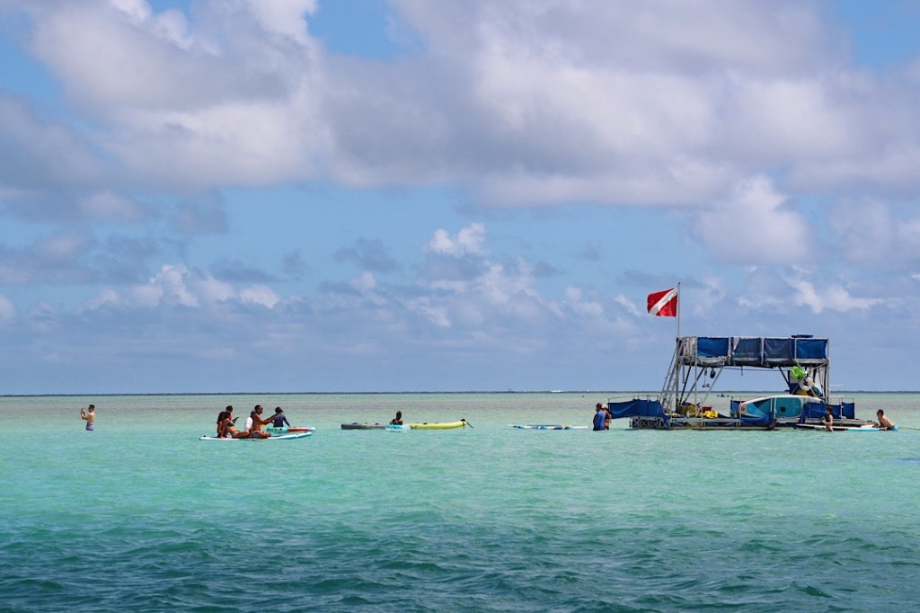 Morgens, Mittags und Abends haben wir den Ankerplatz fast für uns allein. Dazwischen aber wird die Sandbank in getakteten Schichten reichlich genutzt. Ausflugsboote bringen stundenweise Tagestouristen und reichlich “Spielzeug” heran, also Kajaks, Paddleboard, Schwimmwesten und Schnorchelbrillen.