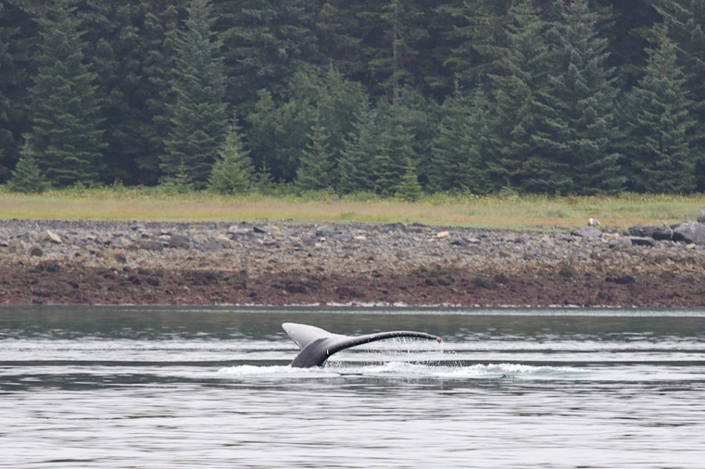 Buckelwale gab es tatsächlich täglich mehrfach zu sehen, mal den Blas, mal springend, mal den Buckel, mal die Fluke. Oft dicht unter Land, weshalb in der Glacier Bay an einigen Orten „Wale areas“ eingerichtet sind, in denen man mittig zwischen den Inseln fahren muss und nach Möglichkeit eine Meile Abstand zum Land einhalten soll. Die Wale halten sich aber nicht an diese Gebiete, wir sehen sie wirklich überall. Im Augenblick kann ich sie gerade hören, sie sind direkt am Boot in unserer Ankerbucht.