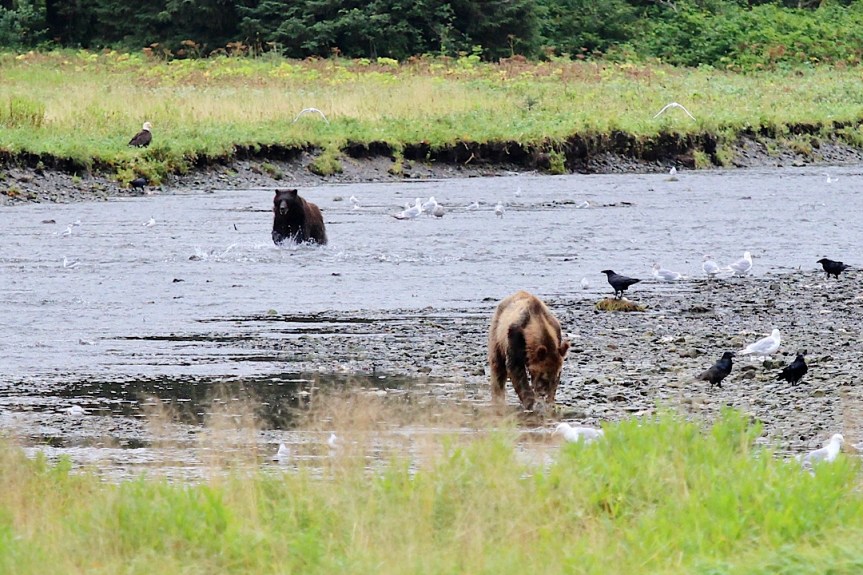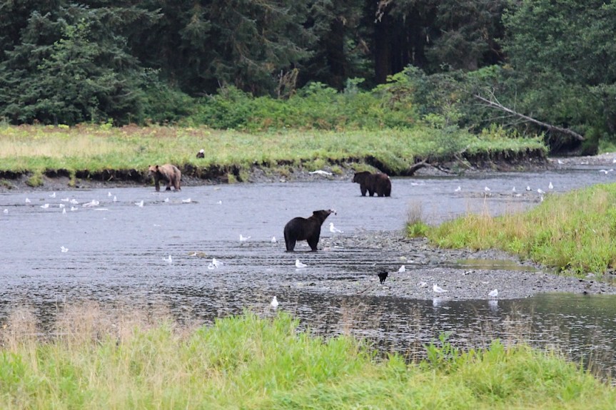 Der Aussichtsturm steht oberhalb einer Biegung des Pack Creek und wir sehen hunderte von Lachsen in dem flachen, steinigen Flussbett. Ein perfektes Jagdrevier für die Braunbären, nur: wir sind offenbar zwischen den Mahlzeiten angekommen. Kein Bär lässt sich blicken. Einige Raben und Möven bedienen sich an den Überbleibseln der letzten Jagd, denn jetzt in der Hauptwanderzeit der Lachse fressen die Bären nur die Delikatessen wie die Haut und die Innereien und lassen den Rest liegen. Oft nehmen auch Adler die angefressenen Lachse mit in die Bäume, auf dem dem Weg durch den Wald konnten wir das zwischendurch auch deutlich riechen.