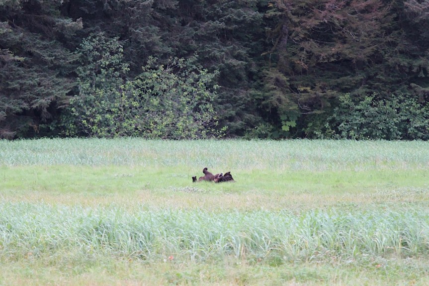 Irgendwann lockt der von der Mutter gefangene Lachs doch zu sehr und die beiden bequemen sich hinüber zur Bärin. Für uns gut sichtbar, trotten die drei durch die niedrige Feuchtwiese Richtung Wald, fangen zwischendurch noch einmal Lachse, kuscheln und tollen dann noch länger im Gras herum.