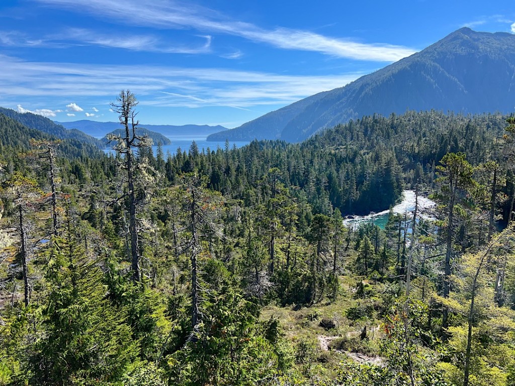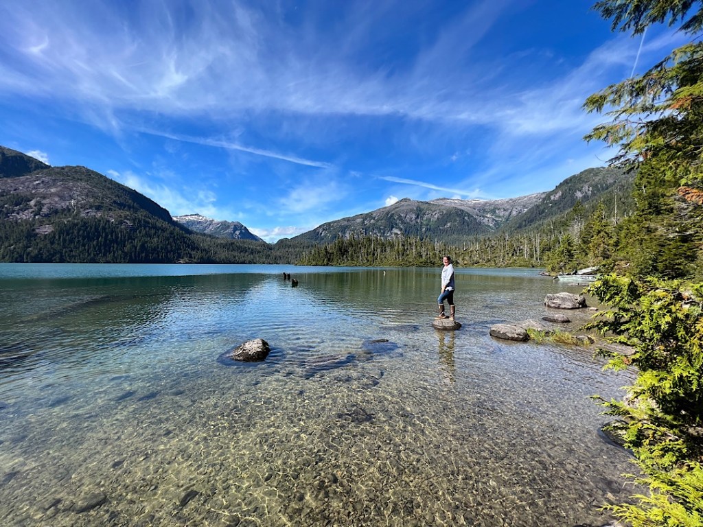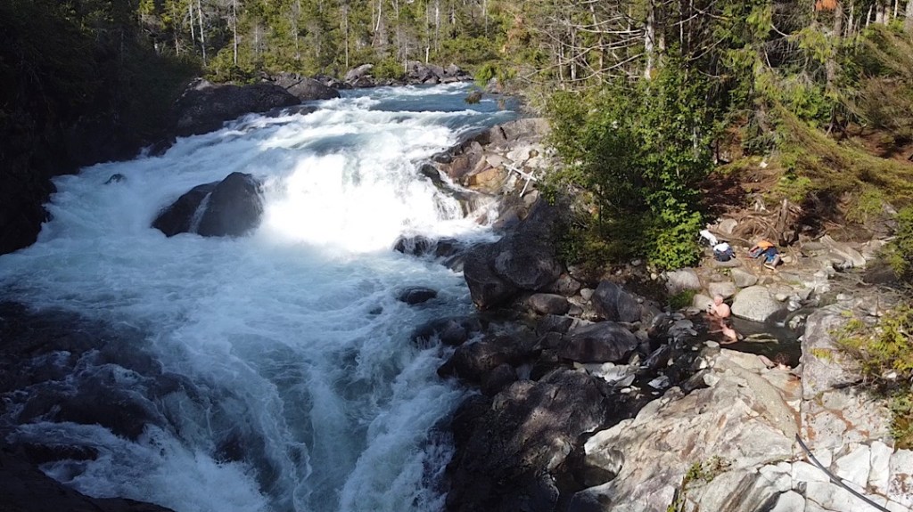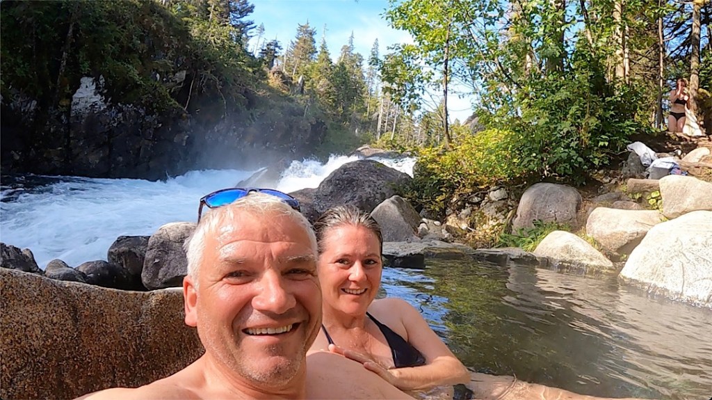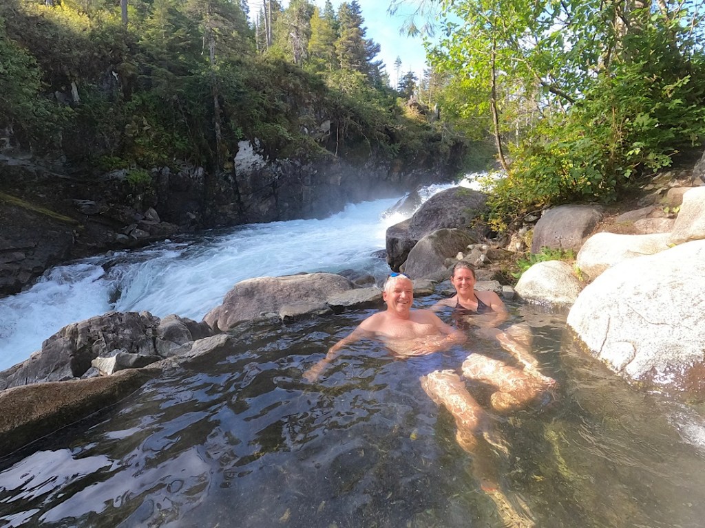 Eine Abzweigung mitten im Wald leitet uns zu den Stromschnellen zwischen Bergsee und Wasserfall. Hier, direkt am Ufer des reißenden Flusses, finden sich die eigentlichen Namensgeber der Bucht, die warm Springs. Eher heiße als warme Quellen, ergießen sie sich in drei gestaffelte Natursteinbecken nacheinander, wobei die Temperatur langsam abnimmt. Das erste ist einfach zu heiß, im dritten Becken finden wir immer noch gesteigerte Badewannentemperatur. Derart aufgeheizt, können wir in ein Kaltwasserbecken der Stromschnellen als Sauna-Tauchbecken nutzen und uns gleich danach wieder wohlig durchwärmen lassen.