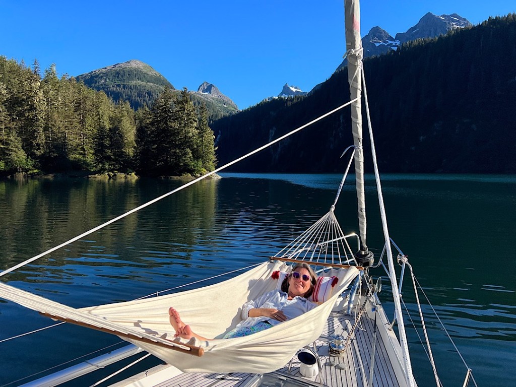 Auf dem Weg bleibt das Trollen diesmal erfolglos, aber am Ankerplatz treffen wir auf unsere Freunde mit der Denali Rose. Flora und Densli Rosé kuscheln, Bill brät auf seinem Bordgrill unsere Lachsfilets, die wir dann bei uns im Cockpit essen. Es wird mal wieder ein schöner Abend. Für den nächsten Tag verabrede ich mich mit Bill zum Heilbutt-Angeln.