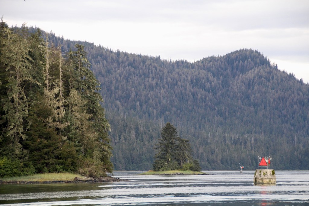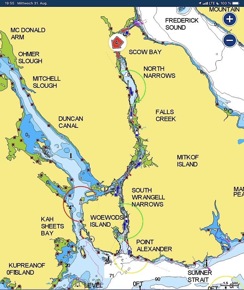 Ein bisschen Bammel haben wir schon. Der Tidenhub in Petersburg beträgt etwa 5 Meter und wir wollen von hier aus nach Süden durch die etwa 21 sm langen Wrangell Narrows fahren. Die natürliche Verbindung zwischen dem Frederick Sound im Norden und der Sumner Strait im Süden ist schon recht schmal, aber an vielen Stellen dazu auch noch flach oder in einigen Buchten und generell entlang der Ufer sogar trocken fallend. Trotzdem ist sie eine der Hauptverbindungsstrecken für den Schiffsverkehr der Inside Passage in Alaska, deshalb ist an besonders flachen Stellen eine 100 m breite Rinne ausgebaggert. Allerdings sind 100 m nicht viel, wenn einem dort Schubverbände oder Kreuzfahrer begegnen. Klar, dass in solchen Engstellen außerdem besonders viel Strömung setzen kann, an unserem geplanten Abfahrtstag sind bis zu 4,9 kn prognostiziert.