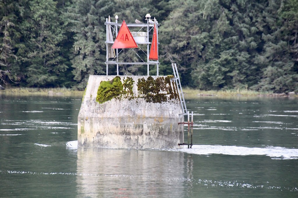 Wir fahren los und wir haben Glück. Ein aufkommender Schubverband einer mit Containern beladener Barge fährt nicht durch, sondern bremst kurz bevor er uns erreicht in der Scow Bay ab um seine Fracht zu entladen. Und erst nach unserer Passage kündigt sich das erste Kreuzfahrtschiff über Funk an. Die Tide schiebt allerdings extrem unterschiedlich, mal fast gar nicht, mal mit 3 kn. Mit der Ebbe verhält es sich „bergab“ genauso, aber wir kommen eben gut durch. Für die eigentlich wunderschöne Landschaft heben wir dabei jedoch kaum ein Auge, die über 50 Seezeichen der gut betonten Passage fordern unsere Aufmerksamkeit.