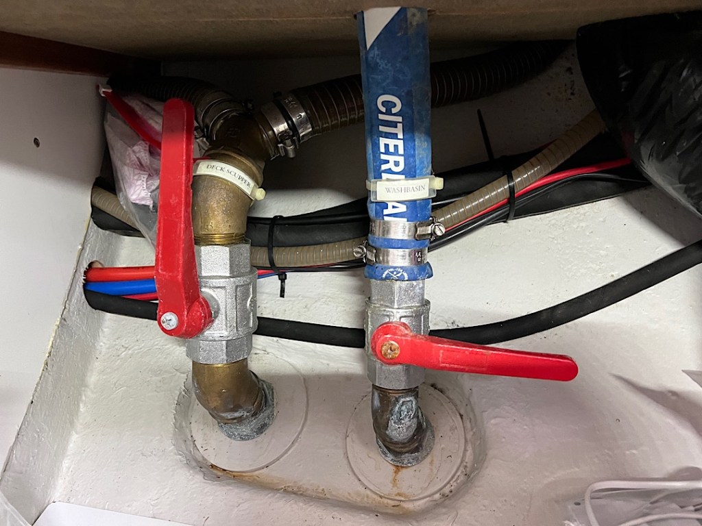 Flora ist eingewintert. Auf dem Bild noch “Work in Progress“, alleine die (erschreckend) vielen Borddurchlässe erfordern da ein planvolles Vorgehen. Zudem dürfen natürlich nicht einfach alle Seeventile geschlossen werden, so laufen zum Beispiel die großen Cockpitlenzer durch den Motorraum und können dort mit Seeventilen verschlossen werden – das wäre für den Winteraufenthalt im Wasser allerdings ebenso wenig praktisch wie das Verschließen der von Hallberg-Rassy zum Glück vorbildlich beschrifteten Decksabläufe (Deck Scupper) wie hier unter dem Waschbecken im achteren Bad.