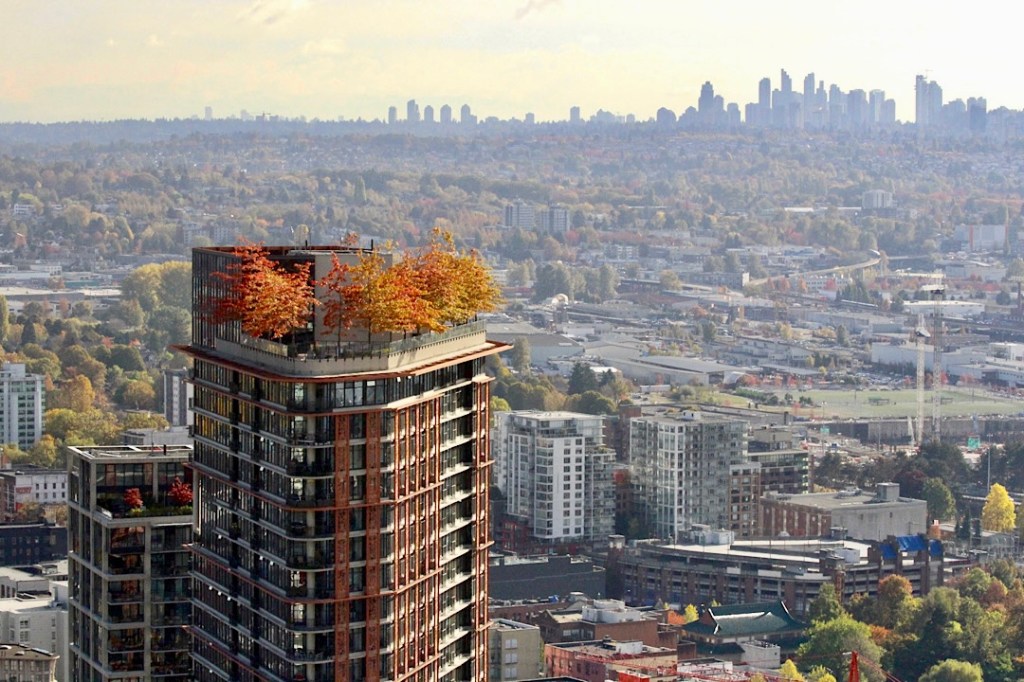 Und nicht nur das. Ein Besuch auf der Aussichtsplattform im Bürogebäude „Vanouver Lookout“ macht deutlich, dass sich die Laubfärbung markant durch das ganze Stadtgebiet zieht. Sogar auf den Wolkenkratzern finden sich zum Teil große Bäume.