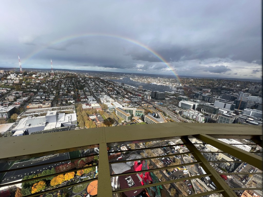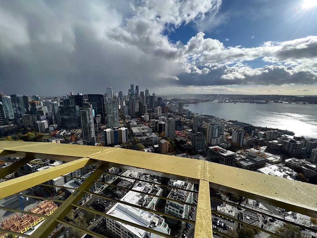 Unser ausgedehnter Spaziergang führt uns dann weiter zur Space Needle. Wir beißen in den sauren Apfel des ziemlich teueren Eintrittspreises und sausen mit dem gläsernen Außenfahrstuhl hoch zur Aussichtsplattform in 150 m Höhe. Allerdings: die Aussicht ist wirklich beeindruckend, sowohl seitlich