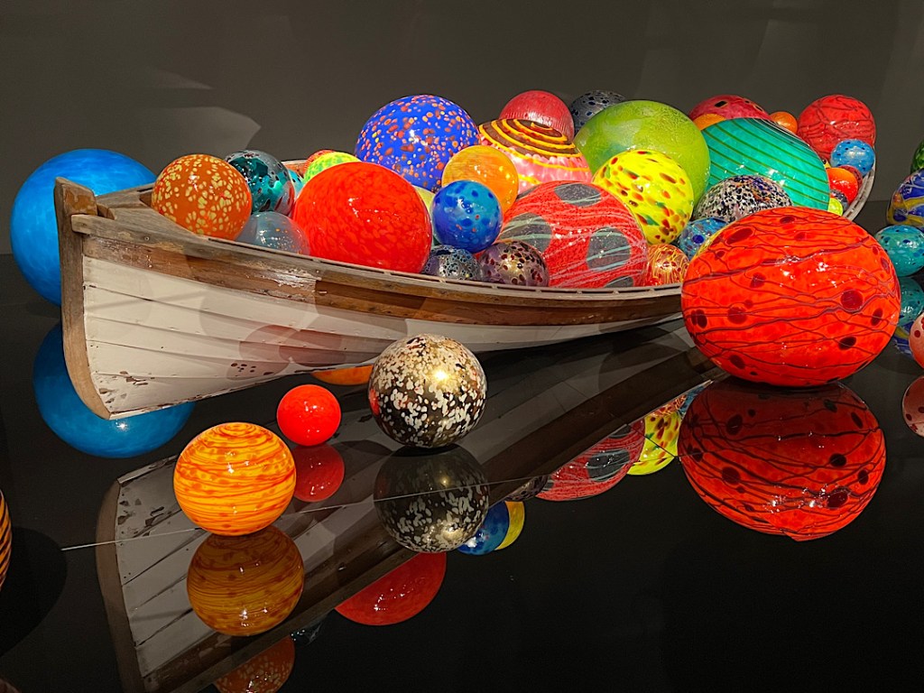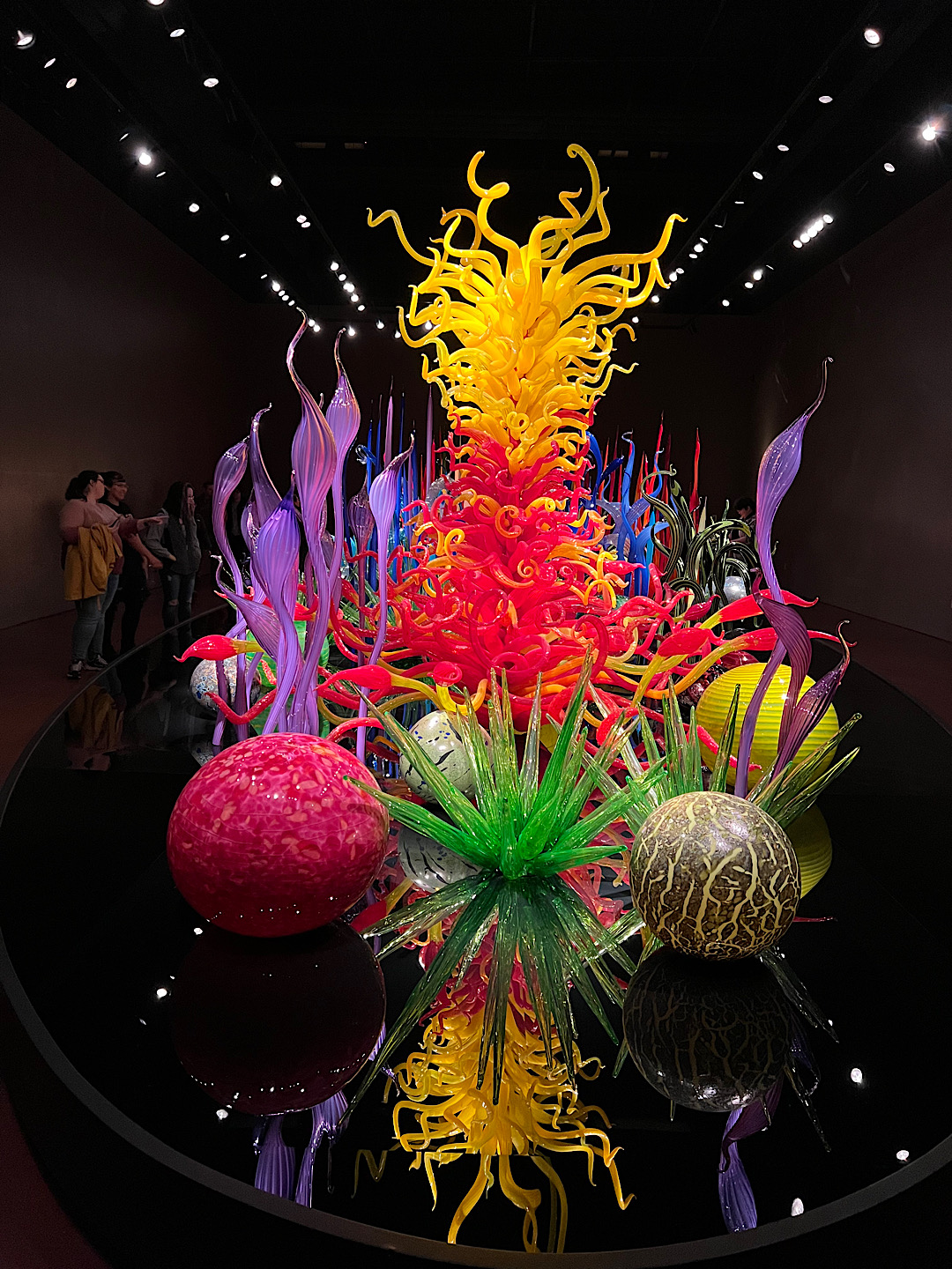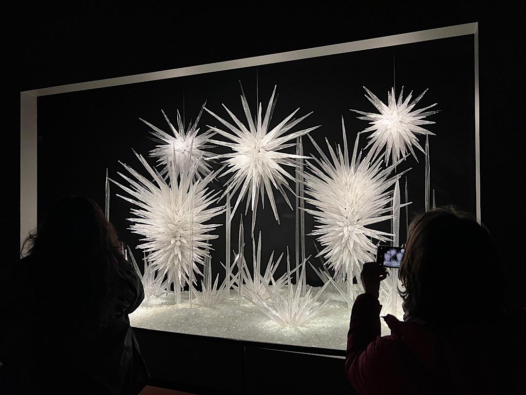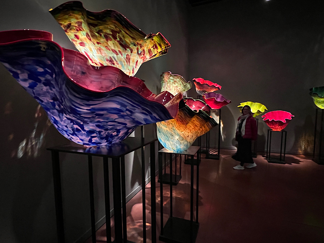 Und diese Ausstellung begeistert uns. Das Werk des Glaskünstlers Dale Chihuly wird hier sowohl in den Innenräumen als auch im Garten umfangreich präsentiert, zudem zeigen Filme im Multimediaraum beieindruckende Perfomances etwa in Finnland, in Venedig und in Jerusalem sowie den Prozess zur Herstellung der zum Teil riesigen Glas-Skulpturen.