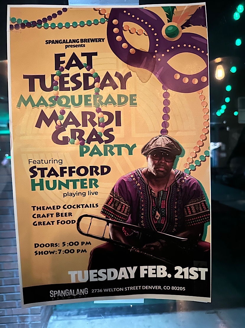 Am Faschingsdienstag (englisch: Fat Tuesday, französisch mit gleicher Bedeutung: Mardi Gras) gehen wir abends zusammen zu einer Mardi-Gras-Party mit Live Musik in einer Kneipe um die Ecke. Aus New Orleans herüber geschwappt ist die Tradition der Mardi-Gras-Beads, allerdings muss hier in Denver für das Umhängen einer solchen Kette nicht die Bluse gelupft werden.