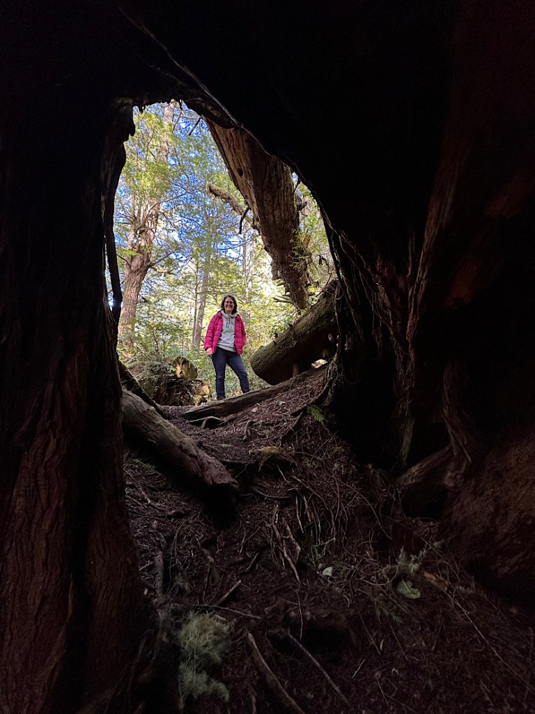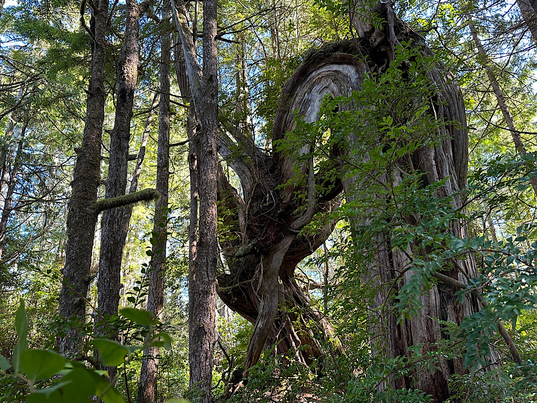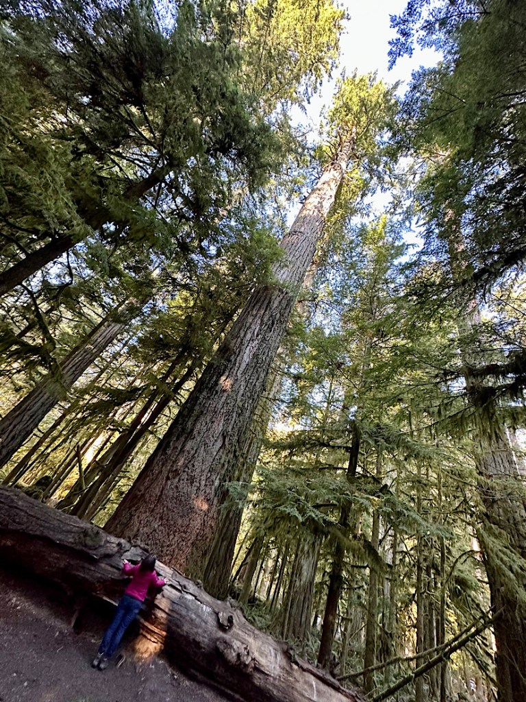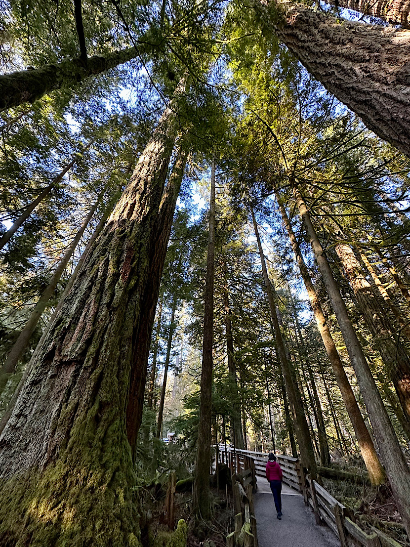 Im MacMillan Park stehen tatsächlich noch diverse über 800 Jahre alte Douglasien (Douglas Fir), umgeben von “nur” 350 Jahre alten Exemplaren. Manches Mal nutzen jüngere Bäume die abgebrochenen Stumpen ihrer Ahnen gar als Steighilfe und Nahrungslieferant. Wanderpfade, an den feuchteren Stellen überwiegend in Form von (auch die Wurzeln schonenden) Bohlenwegen führen durch den dicht bemoosten Wald. Und die zumeist gerade gewachsenen imposanten Bäume, deren Äste bei den „erwachsenen“ Exemplaren erst in großer Höhe beginnen, erinnern tatsächlich an die Säulen einer Kathedrale (oder ist es umgekehrt?). Tatsächlich können Douglasien die Höhe der berühmten Redwoods Küstenmammutbäume erreichen, sind aber schlanker.