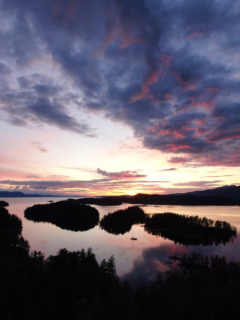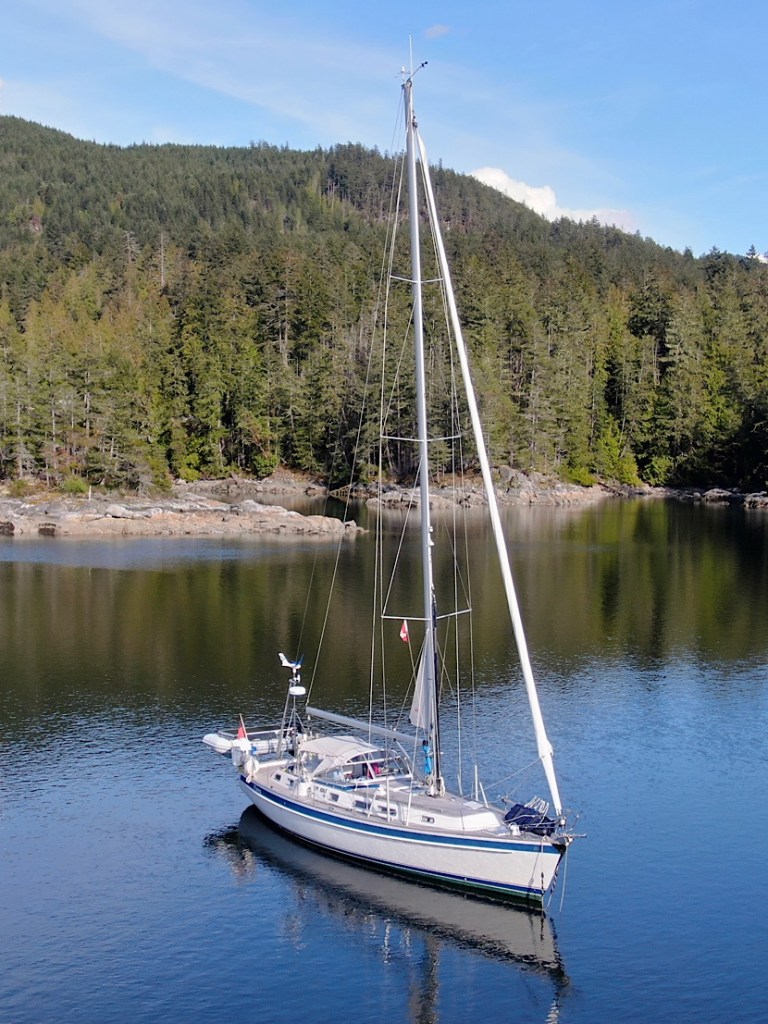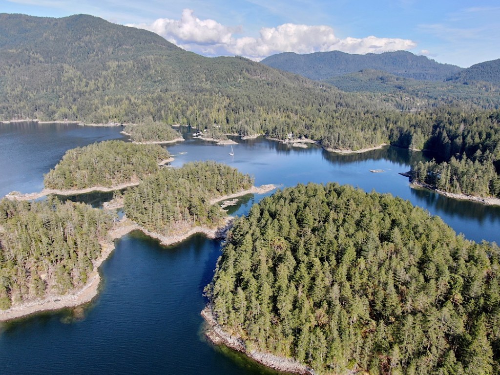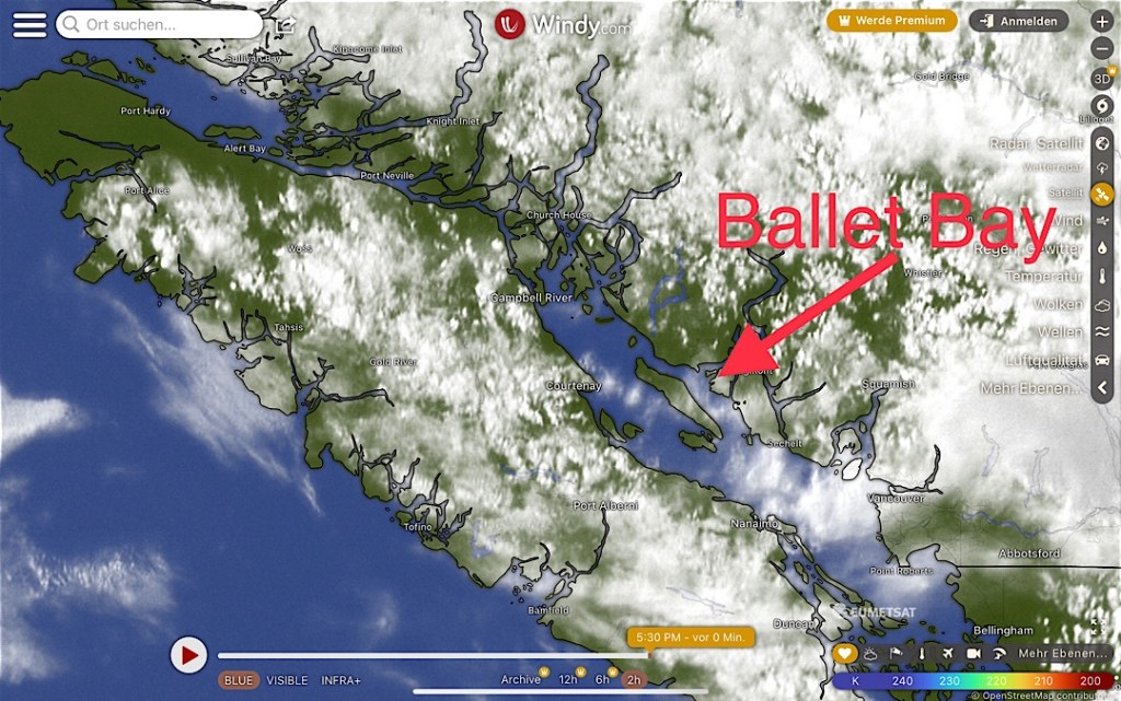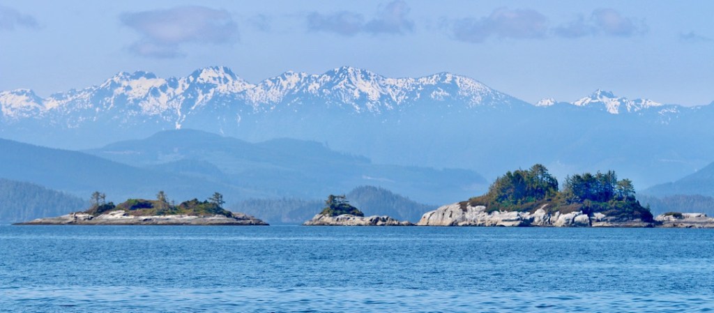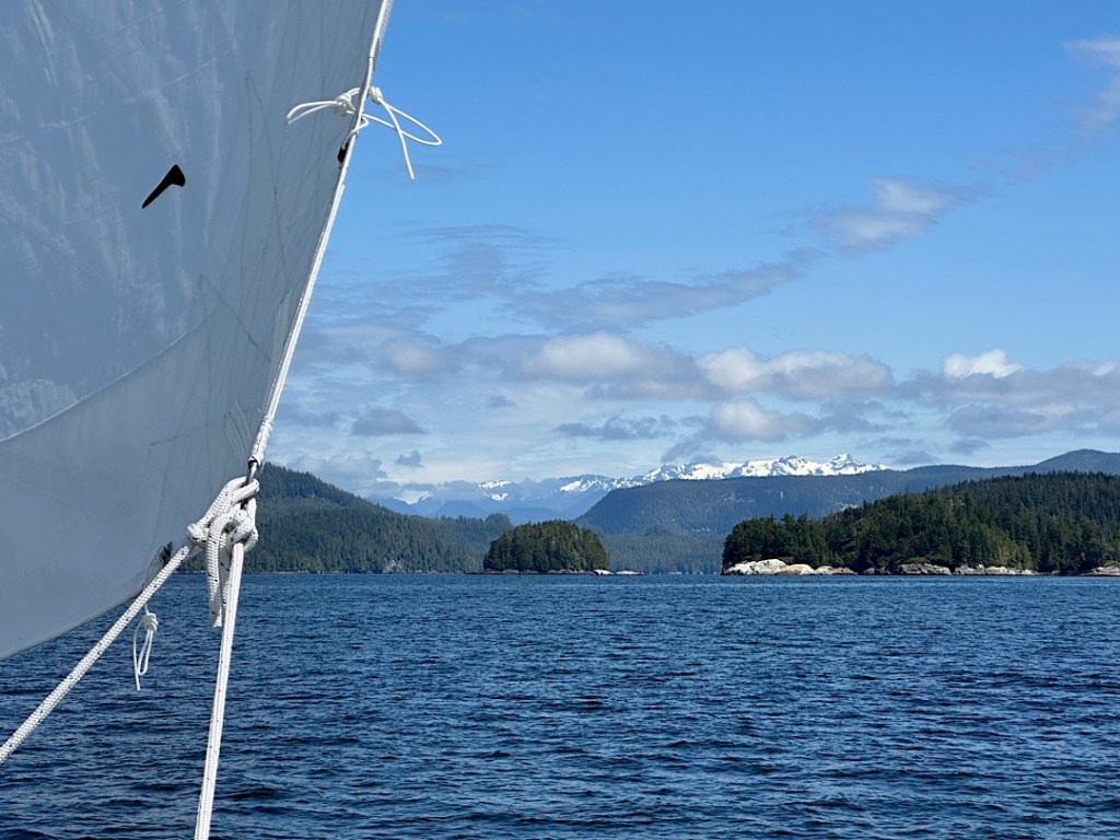 Unsere Route führt uns zunächst unter Motor von Mound Island durch die enge und schöne Providence Passage an Midsummer Island vorbei hinaus in offeneres Wasser. Dort gehen die Segel hoch. An Backbord zeigt sich in der Ferne der Gebirgszug auf Vancouver Island, an Steuerbord die Inselwelt der Broughtons. Wow.