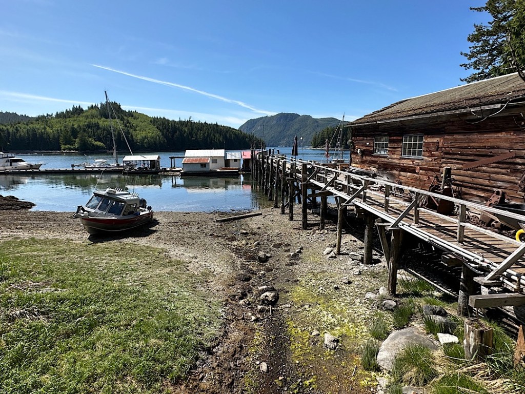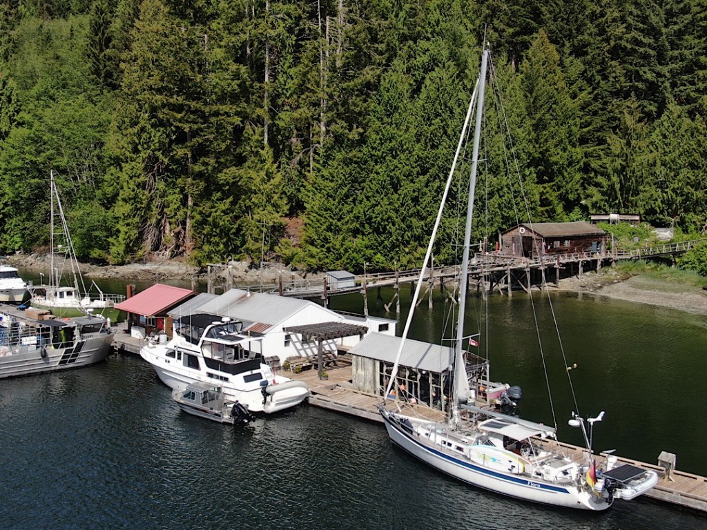 Das Wild ist nicht schüchtern. Die beiden ändern ihre Schwimmrichtung und kommen auf die Flora zu. Aber wir machen ihnen Platz fahren um die nächste Ecke herum in die Sullivan Bay Marina. Diese kleine Marina mit ihren “Float Houses” hat auch einen General Store. Über zwei Wochen nach unserem letzten Einkauf hoffen wir auf frische Milch und vielleicht etwas frisches Gemüse, aber das wird leider beides nichts. Am Donnerstag soll sich das Angebot wieder verbessern, da kommt eine Lieferung (per Wasserflugzeug, hinter einem der Float Houses kann man übrigens auch ein privates Float Plane entdecken).