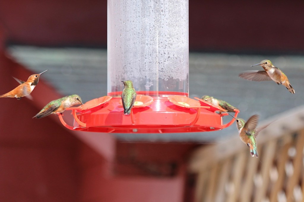 Ohne so enge Angehörige in Europa müssen die “Hummingbirds” auskommen, die wir hier ebenfalls zahlreich antreffen. Kolibris gibt’s nämlich nur in (Nord- und Süd-)Amerika, auf anderen Kontinenten sind sie nicht heimisch. Bis wir sie in Alaska das erste Mal gesehen haben, hatte ich sie nur in tropischen Gebieten vermutet. Tatsächlich aber haben sie sich hier Lebensräume von Alaska bis Feuerland erobert.