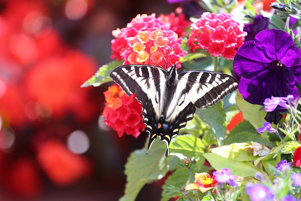 Die Häuser an den Schwimmstegen werden gerade für die Saison herausgeputzt, Stege gekärchert, Farbe erneuert, Blumen gepflanzt. Das freut nicht nur uns, sondern auch die heimische Natur. Mehrere Kanadische Tigerschwalbenschwänze laben sich an der Blütenpracht.