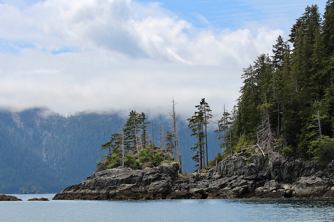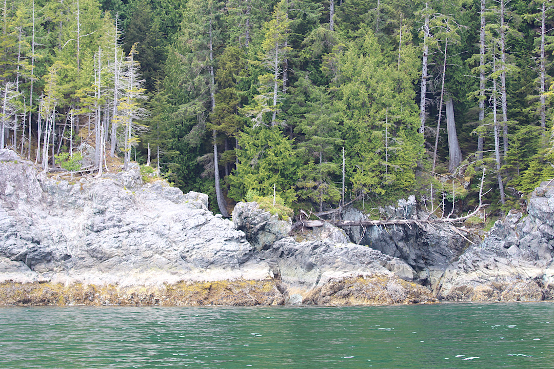 Es geht also zumeist vom Wasser aus ziemlich steil nach oben. Kein Wunder, dass wir immer mal wieder die Spuren zum Teil äußerst heftiger Erdrutsche an den Hängen erkennen. Zuletzt im Jahr 2012 hat unter Haida Gwaii zudem die Erde heftig gebebt (Stärke 7,7 auf der Richter-Skala).