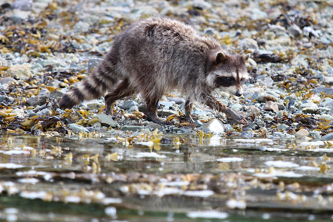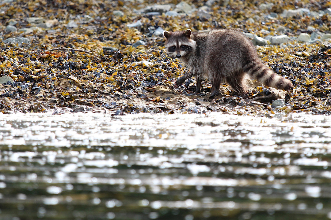 In Thurston Harbour hatten wir auch „Bären“, allerdings die bekanntesten Vertreter aus der Familie der Kleinbären. Unsere kanadischen und amerikanischen Freunde mögen jetzt stöhnen, aber obwohl die eigentlich nur in Nordamerika heimischen Waschbären inzwischen auch in Deutschland als invasive Spezies unterwegs sind und auch dort in Städten Mülltonnen nach Essbarem durchwühlen, wir hatten die dämmerungsaktiven Tiere bisher noch nicht vor die Kamera bekommen. Die Freude wird durch das Wissen gedämpft, dass Waschbären auch auf Haida Gwaii ursprünglich nicht vorkamen und erst in den 1940er Jahren eingeführt wurden, der Pelze wegen. Seitdem haben sie sich – insbesondere für die brütenden Vögel – zu einer auf manchen Inseln für einige Vogelarten bestandsgefährdenden Plage entwickelt.
