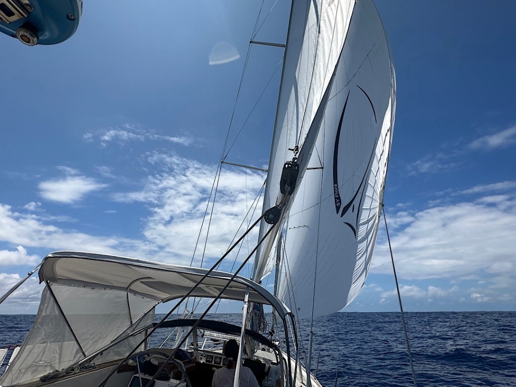 Und es bleibt zunächst äußerst gemächliches Segeln. Eine dunkle Wolke bereitet dem aber gegen 2.00 Uhr nachts ein Ende. Erst bringt sie Regen, dann frischt der Wind auf, wenig später wechselt er um 80 Grad die Richtung und nachdem der Kurs mehrfach angepasst ist schläft der Wind komplett ein. Die Segel schlagen in der Dünung, das hat keinen Zweck. Also muss ich doch Wiebke wecken. Wir rollen die Segel ein, nehmen den Spi-Baum weg. Von 3.00 Uhr an läuft wieder der Volvo. Zwei Stunden später muss sich Wiebke in ihrer Wache revanchieren und mich wecken. Auch für mich ist es also nichts mit den 3 Stunden durchschlafen. Der Wind ist wieder da, jetzt aus 90 Grad, perfekt für den Code0. Diesmal ohne Baum, die Segel werden wieder ausgerollt und bescheren uns einen herrlichen Segeltag.