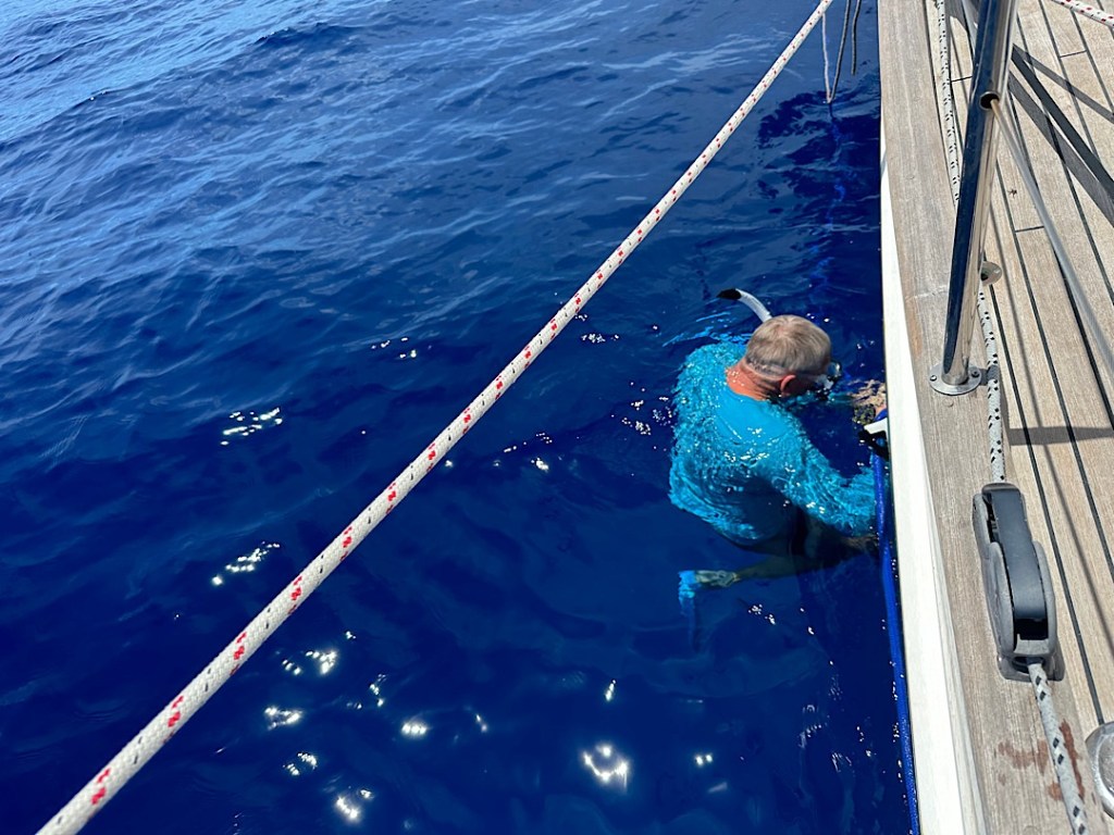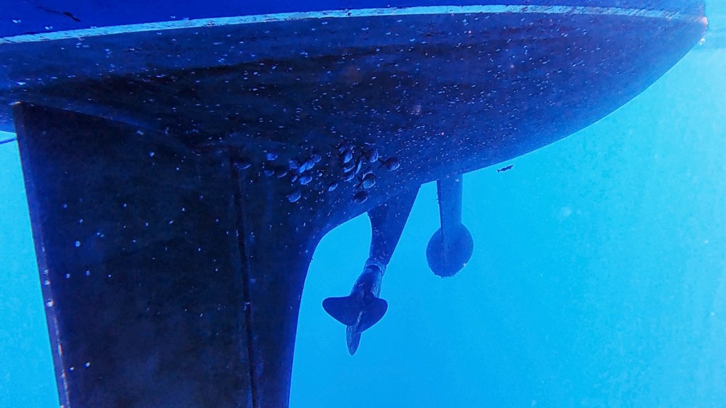 Ein Tag zum „blau machen“ ist es aber trotzdem nicht. Die Flaute will schließlich genutzt sein, um sich das Unterwasserschiff mal anzusehen, zumal am Heckspiegel vom Deck aus erste Entenmuscheln sichtbar sind.