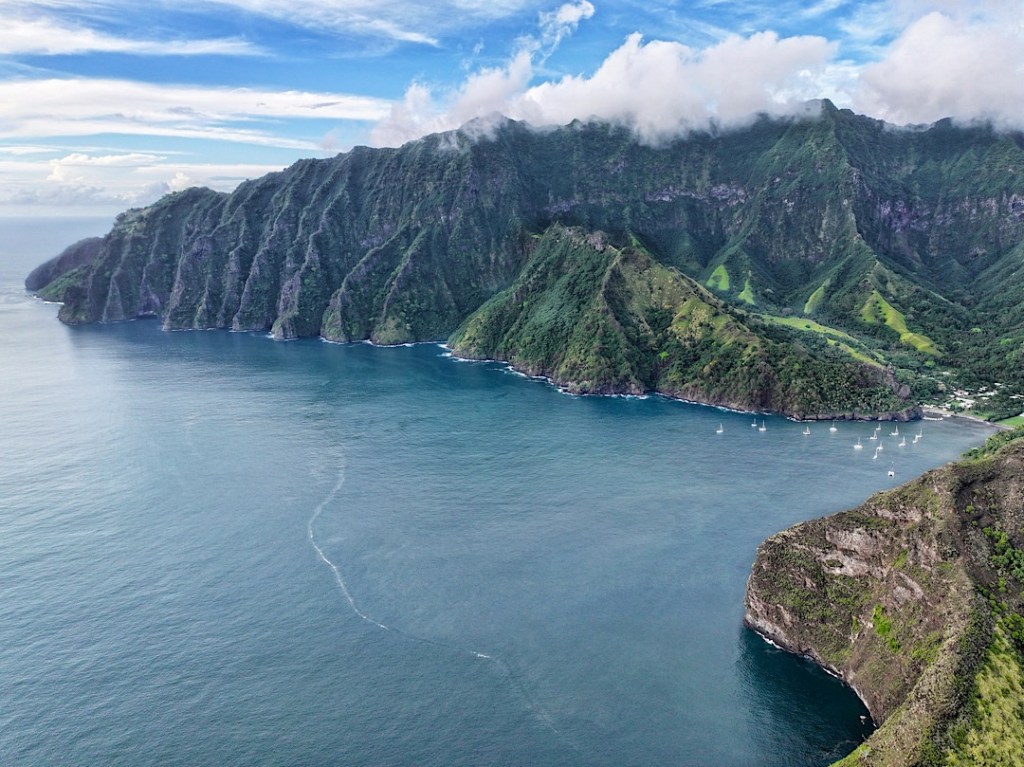 Die Inseln der Marquesas zeigen sich von See kommend als steil aus dem Meer aufsteigende Felsformationen aus dunklem vulkanischen Stein, raue Steilklippen, tief eingeschnittene Täler, wild gebirgige, schwer zugängliche Inseln. Üppig grün an der Ostseite, wo die (Südost-)Passatwinde zum Aufsteigen gezwungen werden. In der kühleren Höhenluft an den Bergspitzen hängen deshalb fast immer Wolken und versorgen die Ostseiten mit üppigen Regenfällen. Die Küsten der windabgewandten Westseiten dagegen sind oft karger.