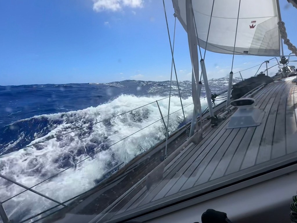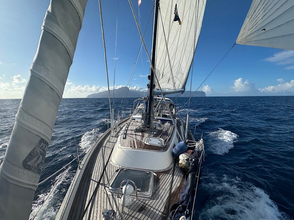 Und so präsentieren sich die Westseiten von Fatu Hiva (das wir hinter uns lassen) und Tahuata (zu der wir auf einem 40 sm Schlag segeln):