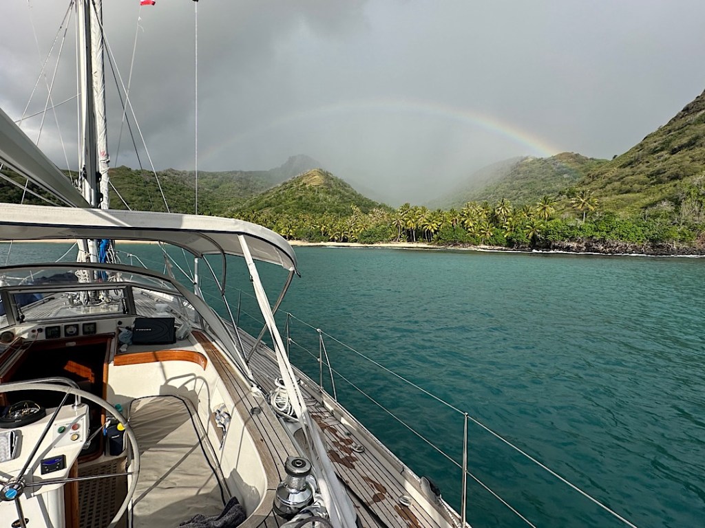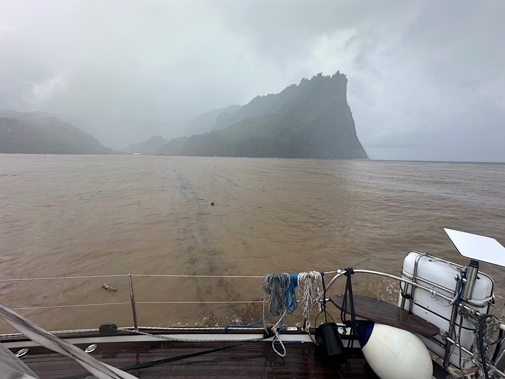 Kaum zurück an Bord, beginnt wieder das tropische „Fenster auf – Fenster zu“-Spiel. Immer wieder schieben sich Wolken über den Bergrücken. Meist tröpfelt es nur kurz, aber insbesondere am späten Nachmittag erleben wir auch hier wieder ziemlich kräftige Tropenschauer. Mit allerdings schönen Begleiterscheinungen: