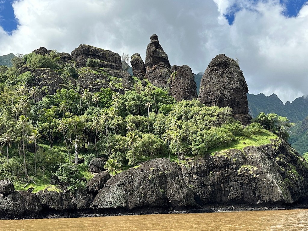 Und auch wenn es dem Klischee der Südsee entspricht: palmengesäumte weiße Sandstrände mögen für andere Inselgruppen typisch sein, für die Marquesas aber sind sie sie es gerade nicht. Hier ist (mangels Ringriff) eher eine Brandung zu erwarten, die sich an schwarzen Felsen bricht oder bestenfalls dunkle Steinstrände hinaufrollt.