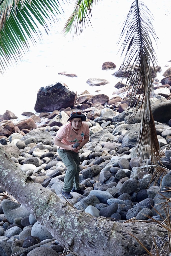 Am Fuß des wie ein Arm mit ausgestrecktem Zeigefinger gen Himmel ragenden Poumaka biegen wir an einer Gabelung des Pfades rechts ab, zurück Richtung Küste. Wie nicht anders zu erwarten, landen wir auf dem kaum weniger steilen ersten Teil des Rückwegs mehr als einmal auf unserem Hosenboden, insbesondere auf nur farnbewachsenen offeneren Steilstücken mit lehmigem Untergrund.