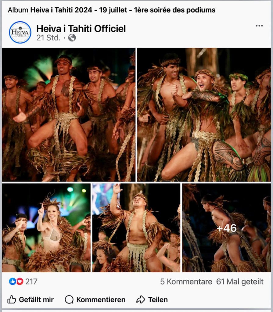 Über fünf Stunden lang dauert die Veranstaltung, von 18:30 bis kurz vor Mitternacht. Bis zu hundert Tänzerinnen und Tänzer zählt eine einzelne Gruppe, dazu kommen Bands und Chöre. Während der Tanzdarbietungen ziehen sich die Teilnehmen zwischen den einzelnen Akten mehrfach um, jeweils mit aufwändigen, phantasievollen Kostümen. Leider sind Fotos bei dieser beeindruckenden Veranstaltung nicht gestattet, deshalb hier nur Screenshots der hier auch verlinkten offiziellen Facebookseite zum Heiva mit vielen weiteren Bildern.
