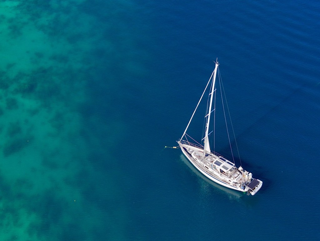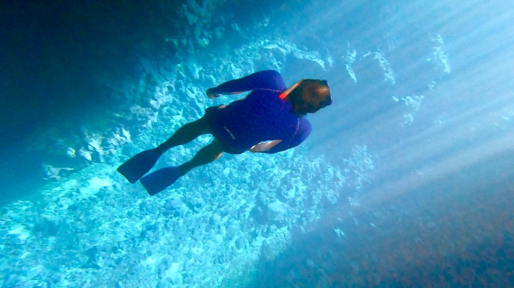 Wiebke steht im Bug und kontrolliert per „Eyeball Navigation“, ob ich am Steuer die Karte richtig lese. Tatsächlich lässt sich die Wassertiefe und die Lage der Bommies jetzt bei hochstehender Sonne so sehr gut abschätzen.