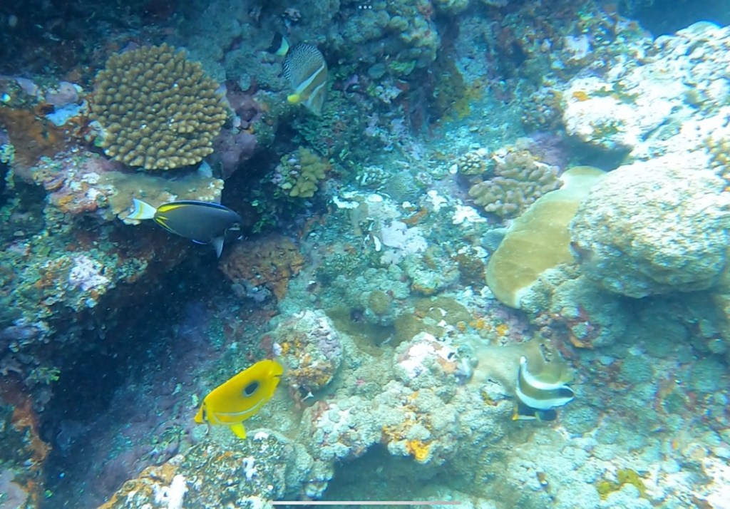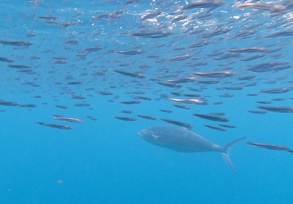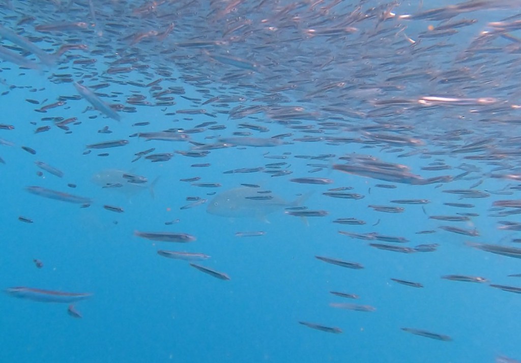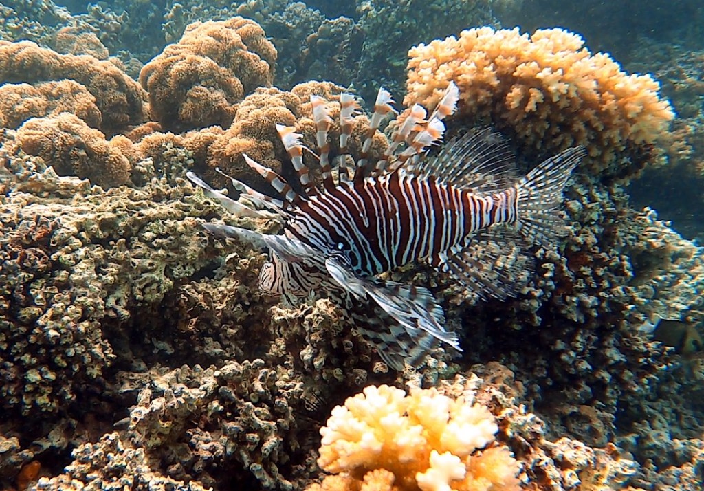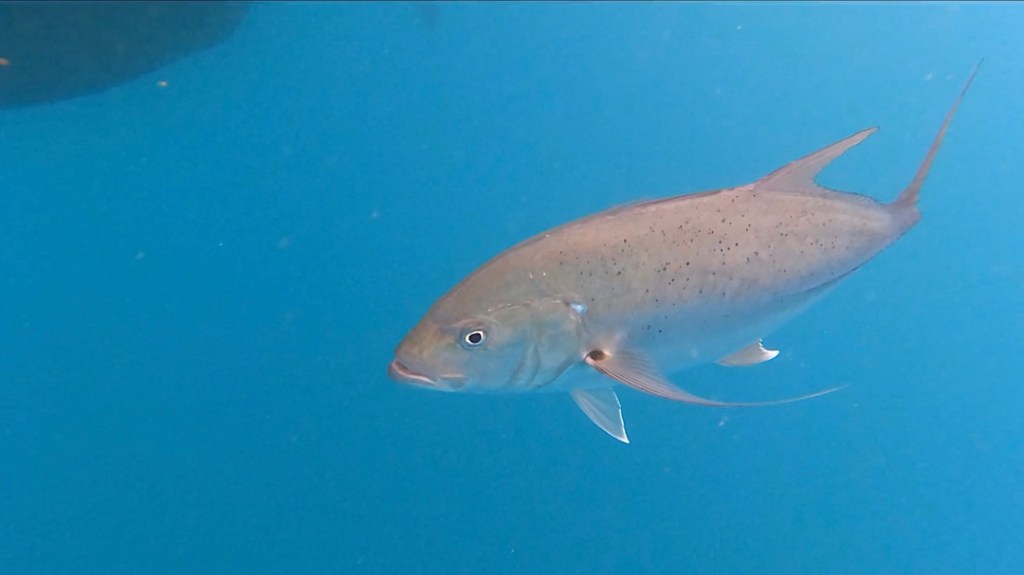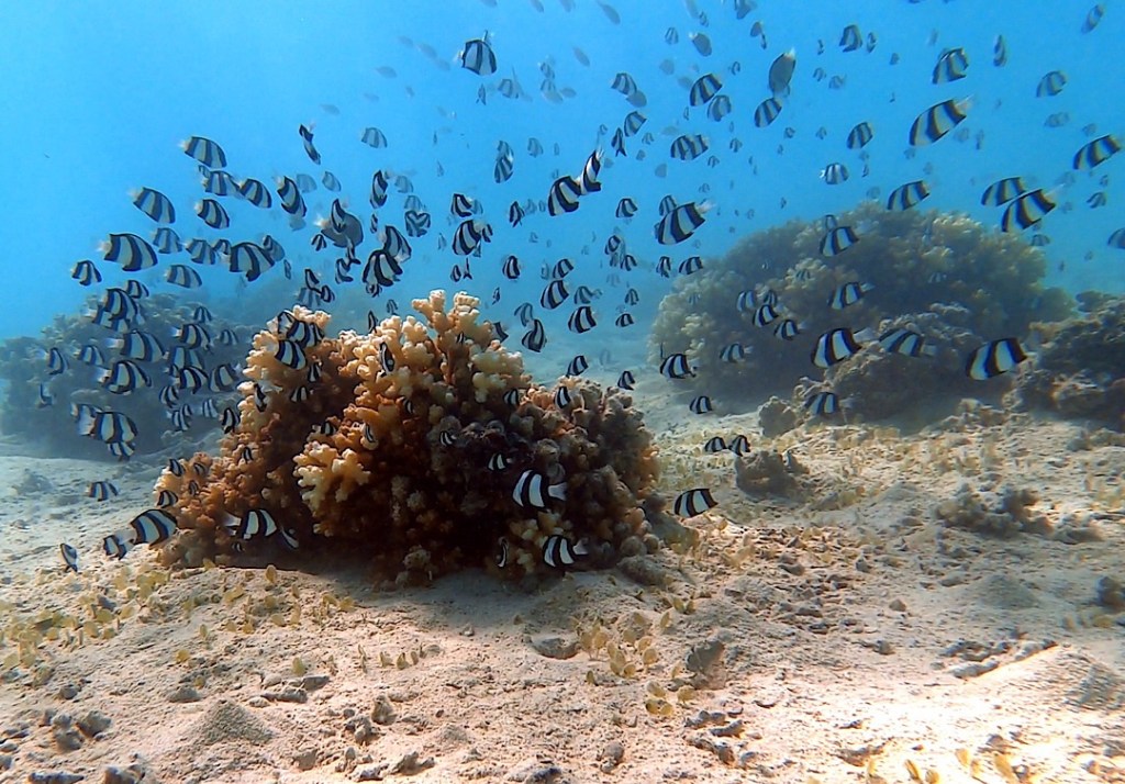 Was zudem auffällt ist die ungeheure Menge an Seesternen. Blaue und rosafarbene Seesterne, aber auch große Kissenseesterne. Und darüber hinaus auch Federsterne. Sie erinnern an farnartige Unterwasserpflanzen, sind aber tatsächlich Tiere, die nah mit Seesternen und Seeigeln verwandt sind. Einzelne Korallen auf den Sandflächen sind von unzähligen schwarz-weißen Preußenfischen und grünblauen Chromies umschwärmt. Und wir finden sogar einen Weißfleck-Kugelfisch. Eigentlich im Lichtspiel der Wellen des flachen Wassers schwer zu erkennen, verrät er sich durch seine leuchtend gelborangenen Augen und den runden schwarzen Schulterfleck um seine Brustflossen. Er bleibt auf seine Tarnung vertrauend regungslos am Grund sitzen.