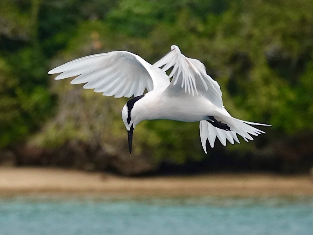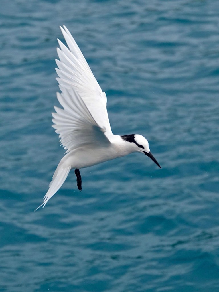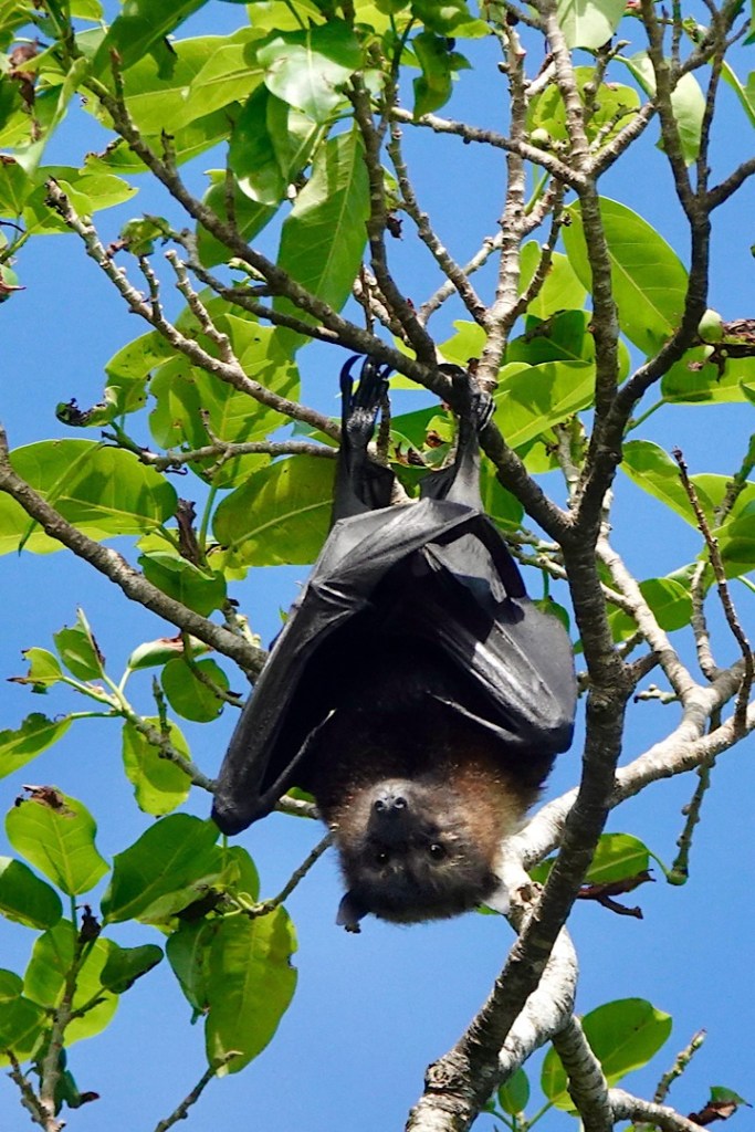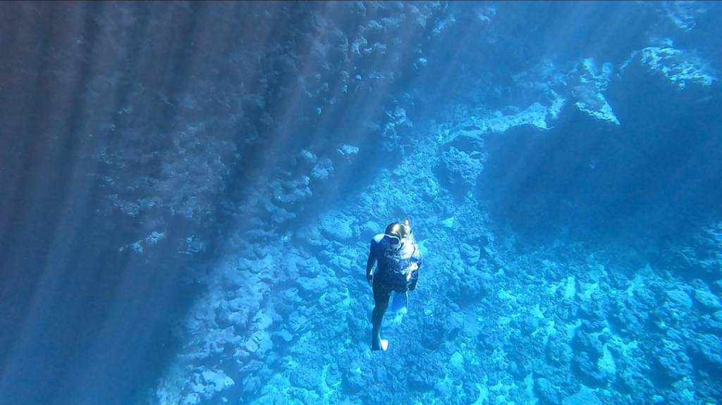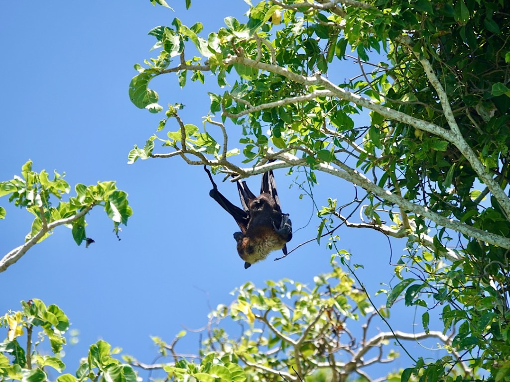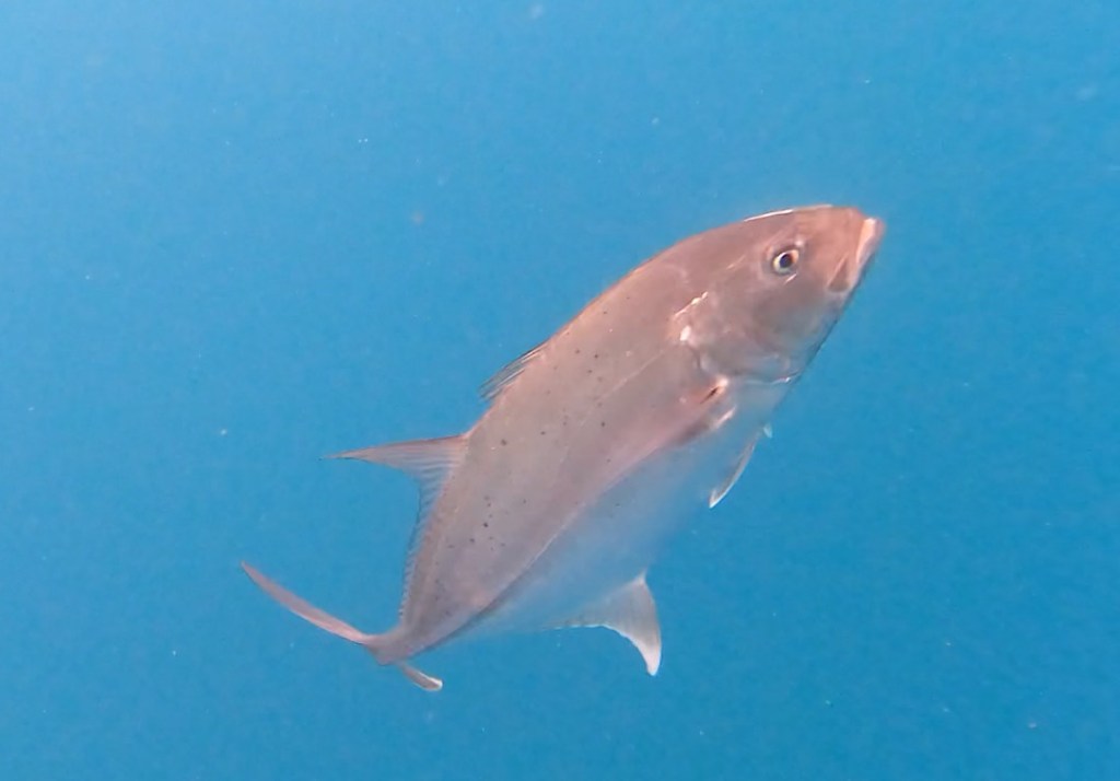 Was zudem auffällt ist die ungeheure Menge an Seesternen. Blaue und rosafarbene Seesterne, aber auch große Kissenseesterne. Und darüber hinaus auch Federsterne. Sie erinnern an farnartige Unterwasserpflanzen, sind aber tatsächlich Tiere, die nah mit Seesternen und Seeigeln verwandt sind. Einzelne Korallen auf den Sandflächen sind von unzähligen schwarz-weißen Preußenfischen und grünblauen Chromies umschwärmt. Und wir finden sogar einen Weißfleck-Kugelfisch. Eigentlich im Lichtspiel der Wellen des flachen Wassers schwer zu erkennen, verrät er sich durch seine leuchtend gelborangenen Augen und den runden schwarzen Schulterfleck um seine Brustflossen. Er bleibt auf seine Tarnung vertrauend regungslos am Grund sitzen.
