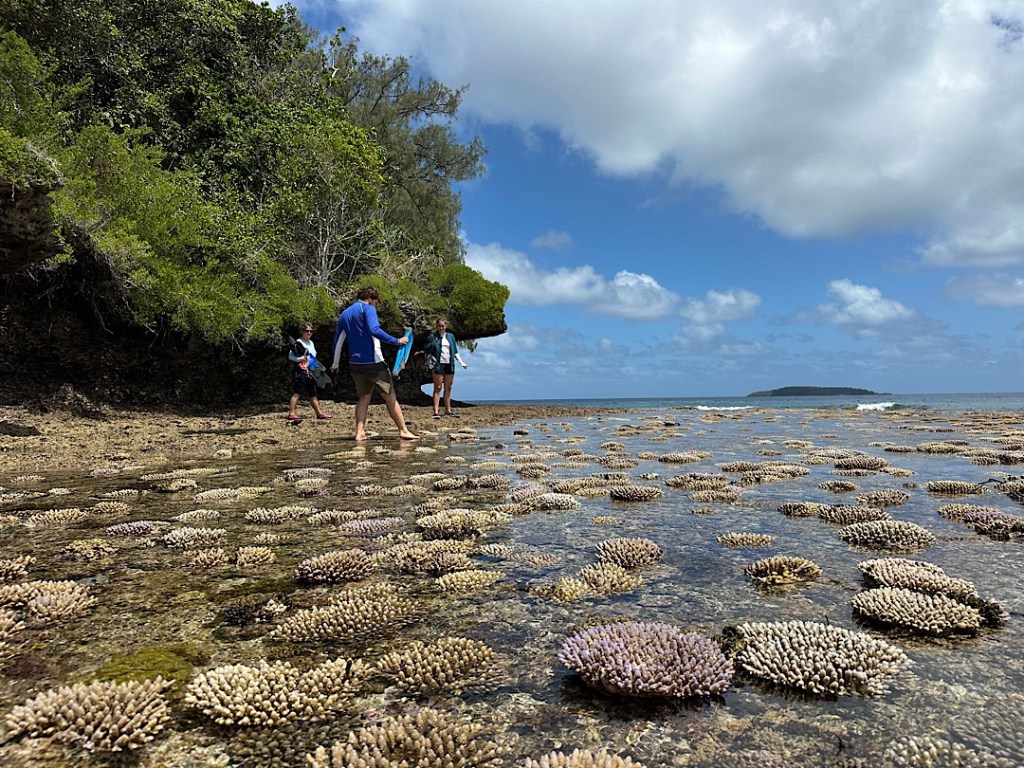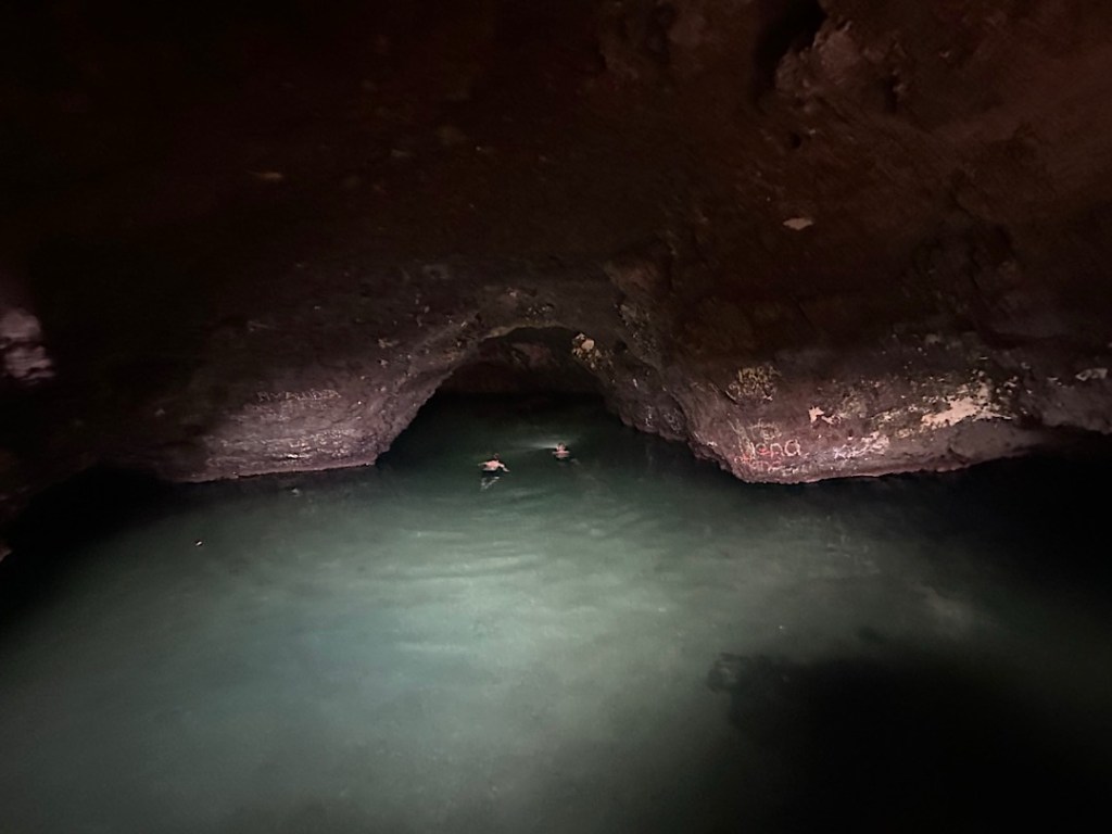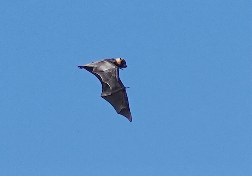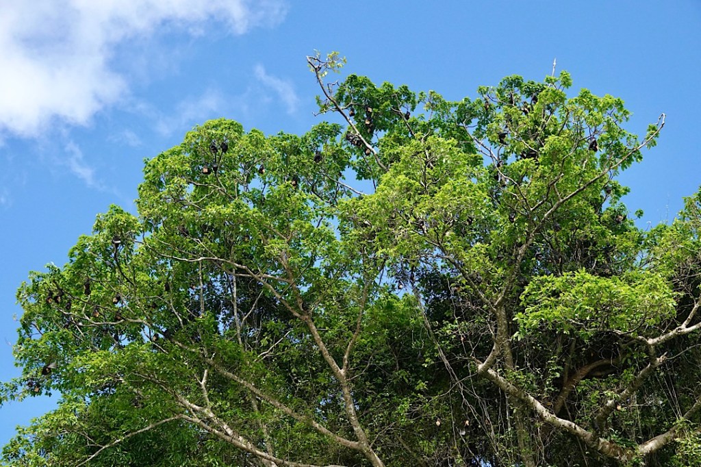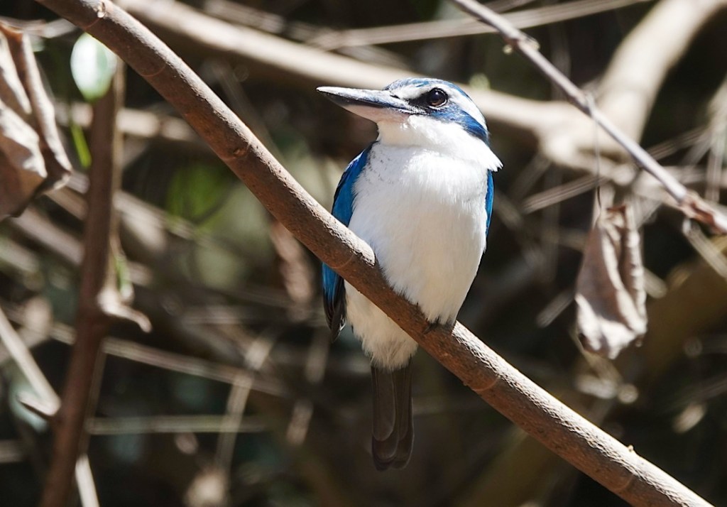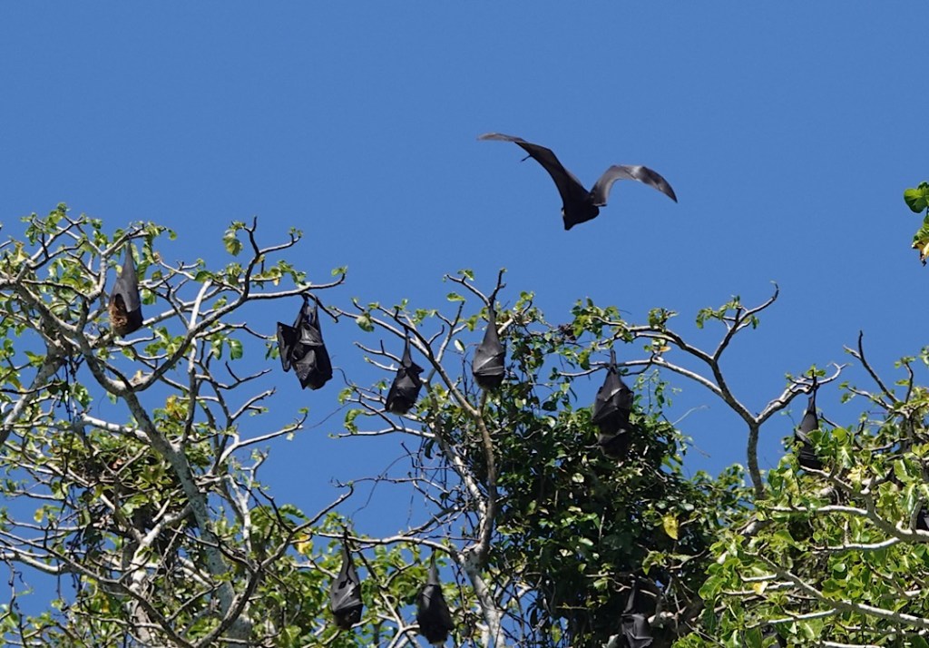 Was zudem auffällt ist die ungeheure Menge an Seesternen. Blaue und rosafarbene Seesterne, aber auch große Kissenseesterne. Und darüber hinaus auch Federsterne. Sie erinnern an farnartige Unterwasserpflanzen, sind aber tatsächlich Tiere, die nah mit Seesternen und Seeigeln verwandt sind. Einzelne Korallen auf den Sandflächen sind von unzähligen schwarz-weißen Preußenfischen und grünblauen Chromies umschwärmt. Und wir finden sogar einen Weißfleck-Kugelfisch. Eigentlich im Lichtspiel der Wellen des flachen Wassers schwer zu erkennen, verrät er sich durch seine leuchtend gelborangenen Augen und den runden schwarzen Schulterfleck um seine Brustflossen. Er bleibt auf seine Tarnung vertrauend regungslos am Grund sitzen.