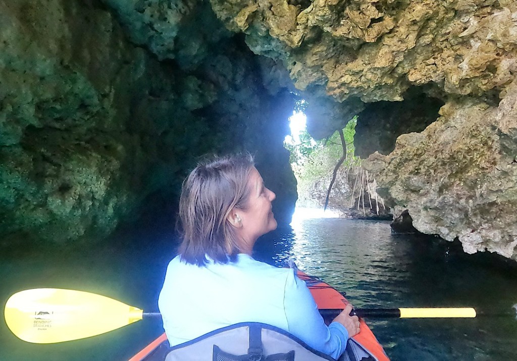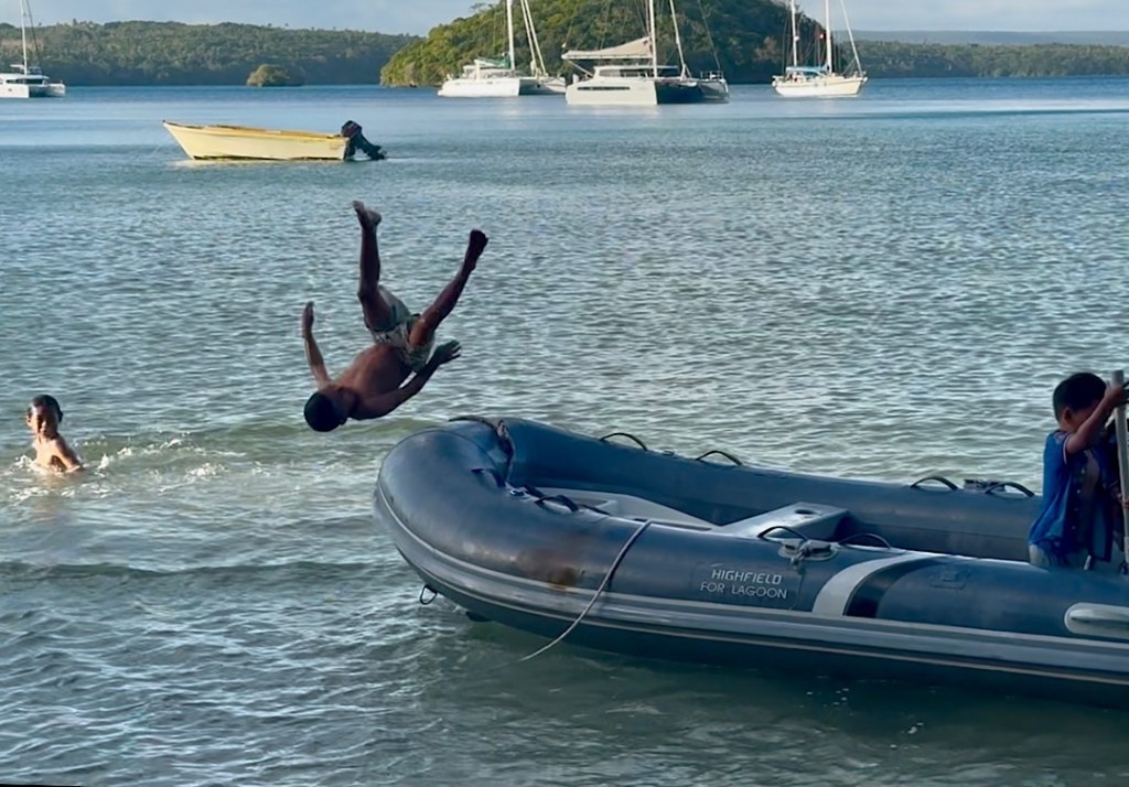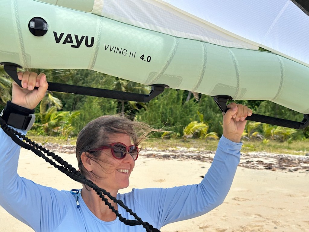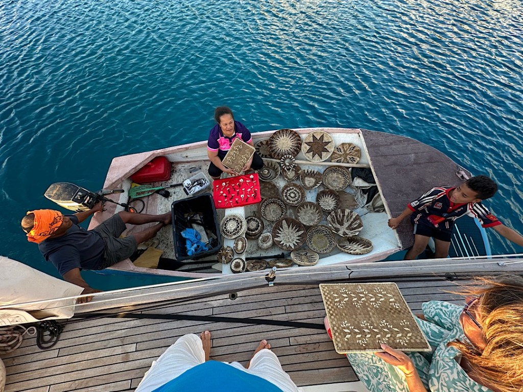 Auch sonst bekommen wir an diesem Ankerplatz einiges geboten. So kann ich hier mal wieder schön Wingfoilen, der Wind hat immer noch nicht abgenommen. Und gegen Abend legt ein kleines Boot vom einzigen Gebäude am Ufer ab und fährt zu den einzelnen Ankerliegern. Anders als zunächst vermutet, soll aber keine Ankergebühr einkassiert werden, stattdessen wird uns geflochtenes und geschnitztes Kunsthandwerk angeboten.