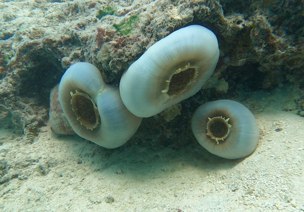 Am nächsten Morgen verholen wir deshalb zum besser gegen diese Windrichtung und die damit einher gehenden Wellen geschützten Ankerplatz #10 (Lisa Beach). Wie schon am Ankerplatz #22 gehen wir auch hier wieder schnorcheln. Diesmal ist es allerdings kein steil abfallendes Riff mit vielen Fischen, sondern ein Korallengarten im Flachwasserbereich. Wir entdecken unter anderem Anemonenfische, bunte Schwämme und Elefantenohren (Korallen, die fast wie Quallen aussehen).