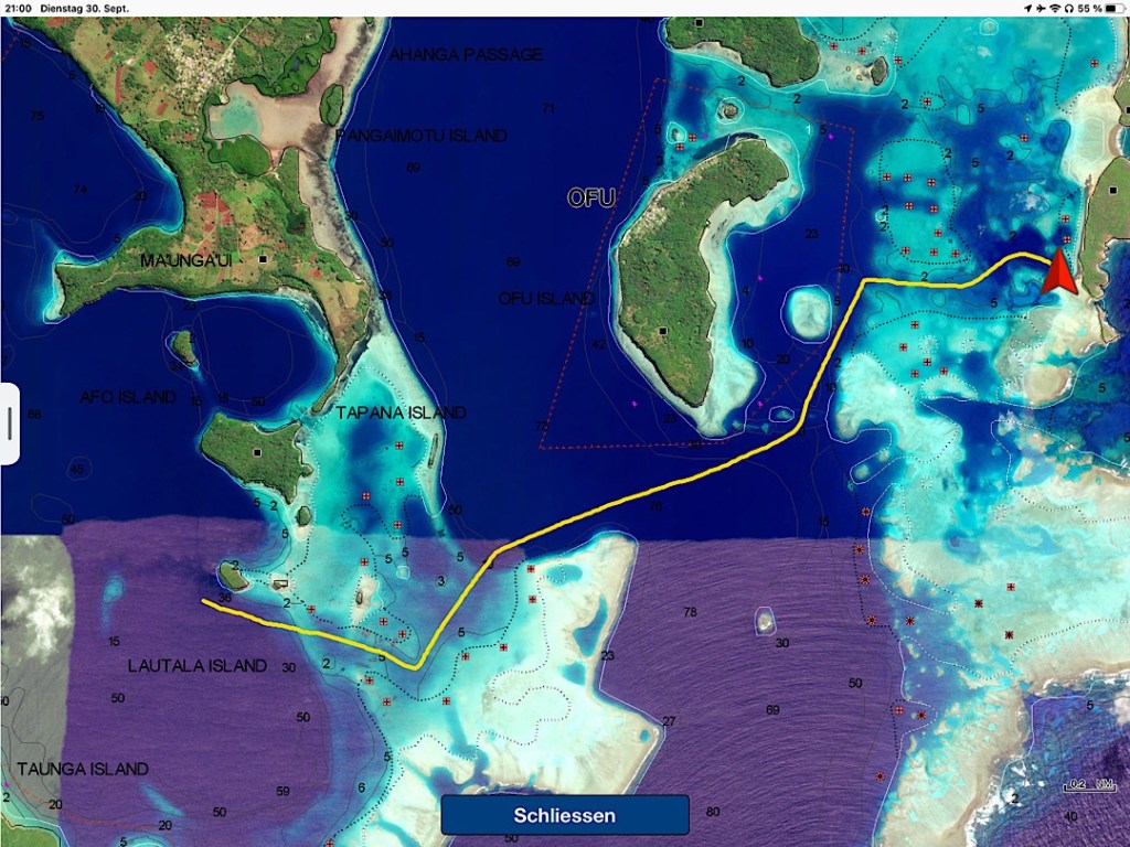 Wir kommen im Zickzack unbeschadet durch das Gewirr und finden einen herrlichen Ankerplatz (#30, Kenutu). An unserem Platz liegen wir nahe am Durchbruch zwischen den Inseln Kenutu und Lulu. Nach Norden hin schließen sich mit weiteren Durchbrüchen die Inseln Umuna, Faioa und Koloa an. Befahrbar ist keiner dieser Durchbrüche, bei Ebbe trocken fallende Riffe schotten die Lagune hier ab und setzen sich auch nach Süden noch weiter fort. Zusammen mit den Riffen und Flachs innerhalb dieses Teils der Lagune führt das zu einem Farbenspiel aus Grün, Türkis und Blau, das wohl eine ganze Menge von der Zeit verblasste Südseeträume wieder kolorieren kann.